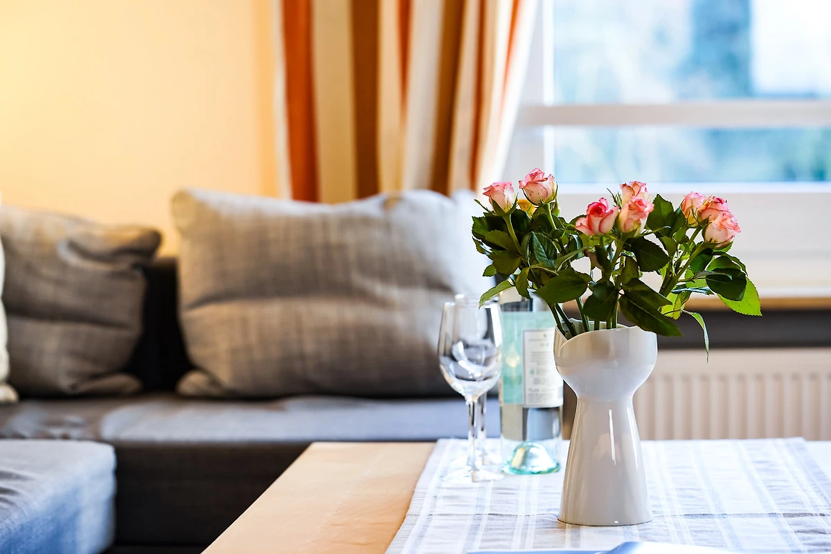 Das gemütlich eingerichtete Wohnzimmer verfügt über eine Schlafcouch (140x200) für zwei Personen, eine Schrankwand und einen grossen SAT-Flat-TV, der zu entspannten Abenden einlädt. Ein Esstisch mit vier Stühlen ergänzt die Ausstattung. Selbstverständlich steht Ihnen kostenloses W-LAN während Ihres Aufenthaltes zur Verfügung.