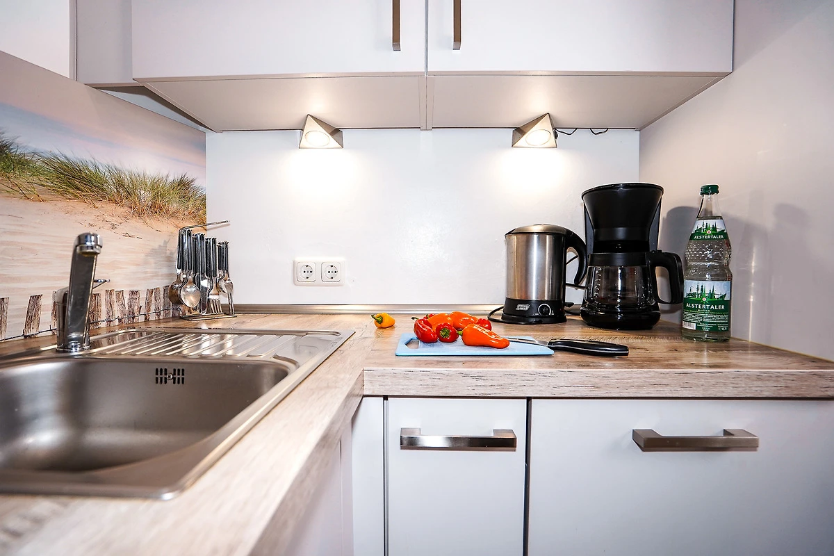 Die separate Küche ist voll ausgestattet und bietet unter anderem einen 4-Kochfelder-Herd, Backofen, Spülmaschine, Kühlschrank mit Gefrierfach und weitere kleine Küchenhelfer wie Kaffeemaschine, Wasserkocher und Toaster.