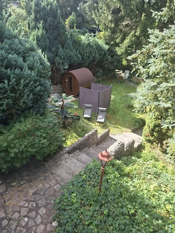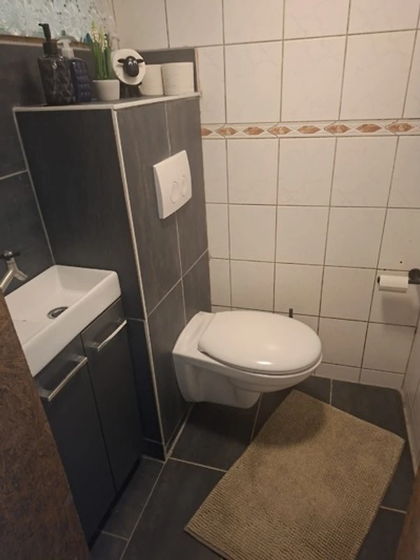 Bad mit Dusche und 2 separaten WCs. Eines davon im oberen Bereich mit Dusche und WC für das kleine Geschäft. Alles andere ungestört im WC im Souterrain des Hauses, welches über die Terrasse und Treppe hinunter erreichbar ist.