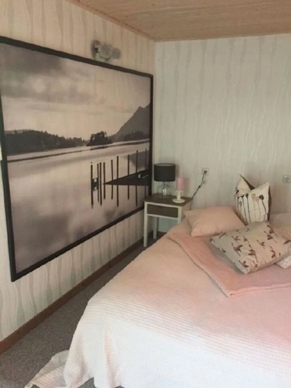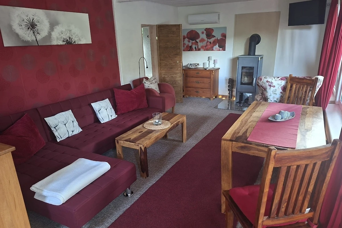 Es ist ausgestattet mit WLAN, Sat-TV, Amazon Prime, Soundbar, 1 x 2 und 1 x 1 Schlafplätze (Schlafzimmer mit Doppelbett (1,80 m x 2,00 m) und Schlafcouch im Wohnzimmer)