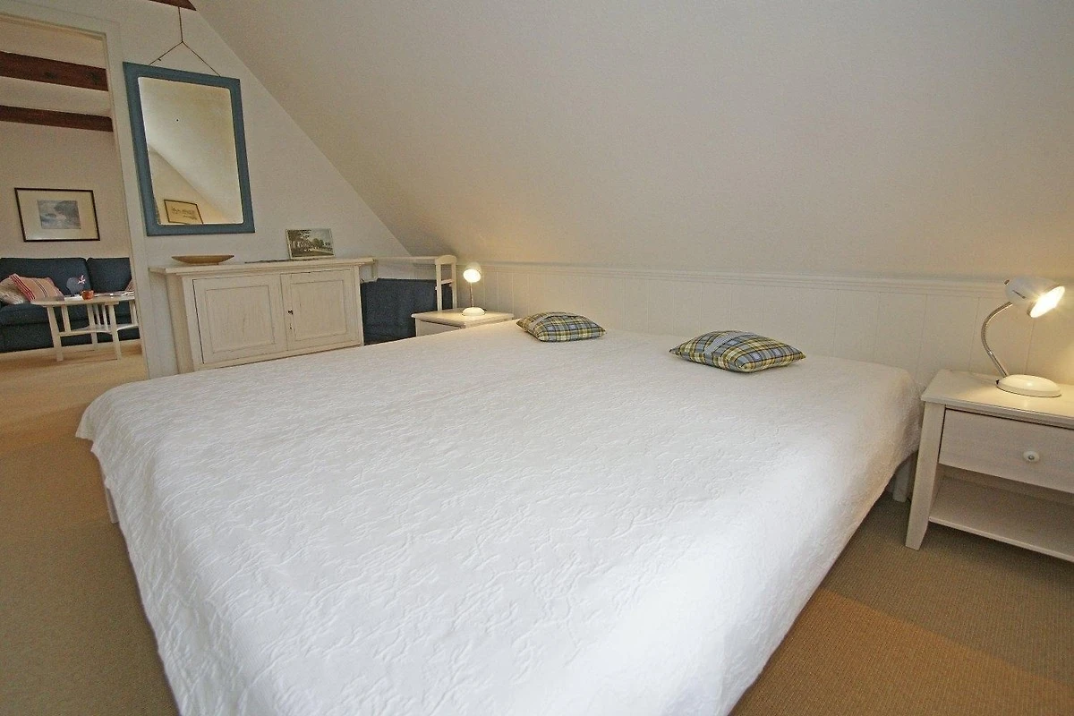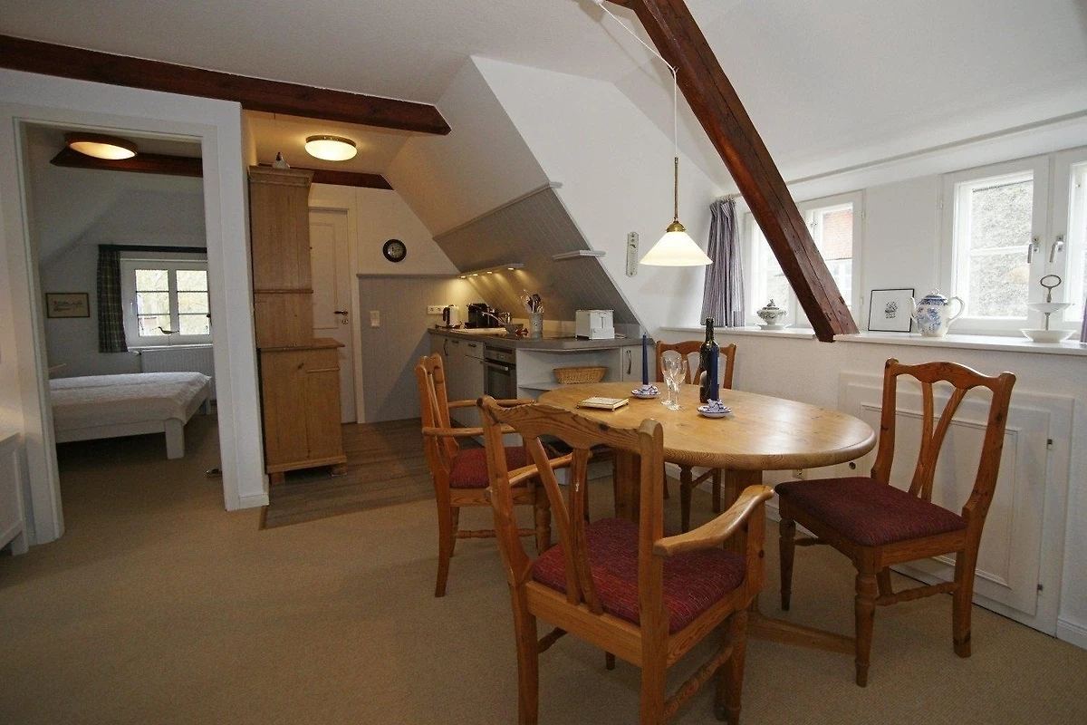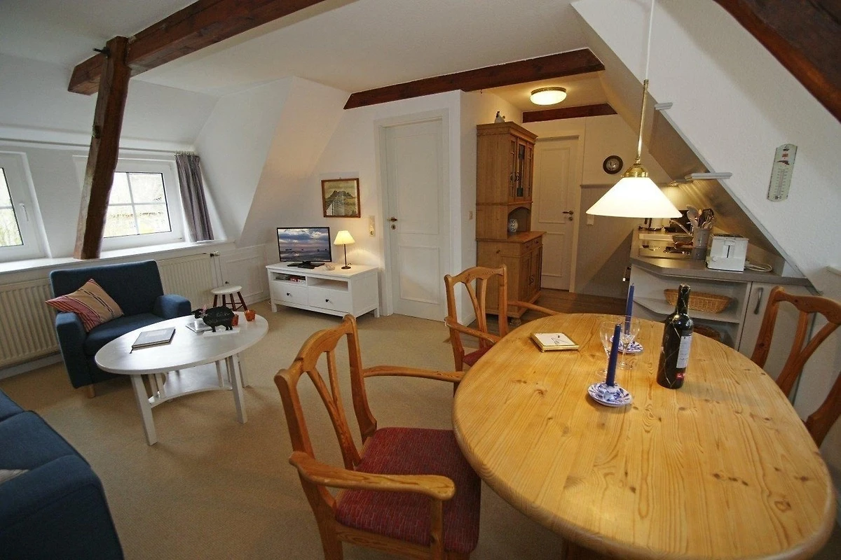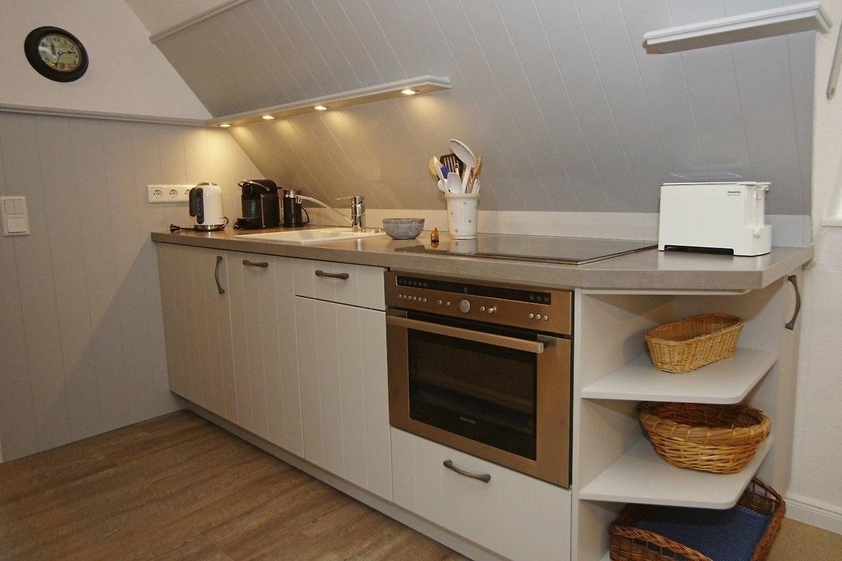 Die Ferienwohnung in Utersum bietet eine gemütliche Unterkunft für bis zu 2 Personen und erstreckt sich über 30 m². Im Erdgeschoss befindet sich ein Wohn-/Schlafzimmer mit einem komfortablen Doppelbett (190x200 cm), einer Sitzecke mit Sofa und Sessel sowie einem Flachbildschirm. Die Wohnküche ist mit einem 4-Plattenherd, Backofen, Geschirrspüler, Kühlschrank und weiteren Geräten wie Kaffeemaschine und Wasserkocher ausgestattet. Das Duschbad mit Aussenfenster wurde zuletzt im April 2020 renoviert.