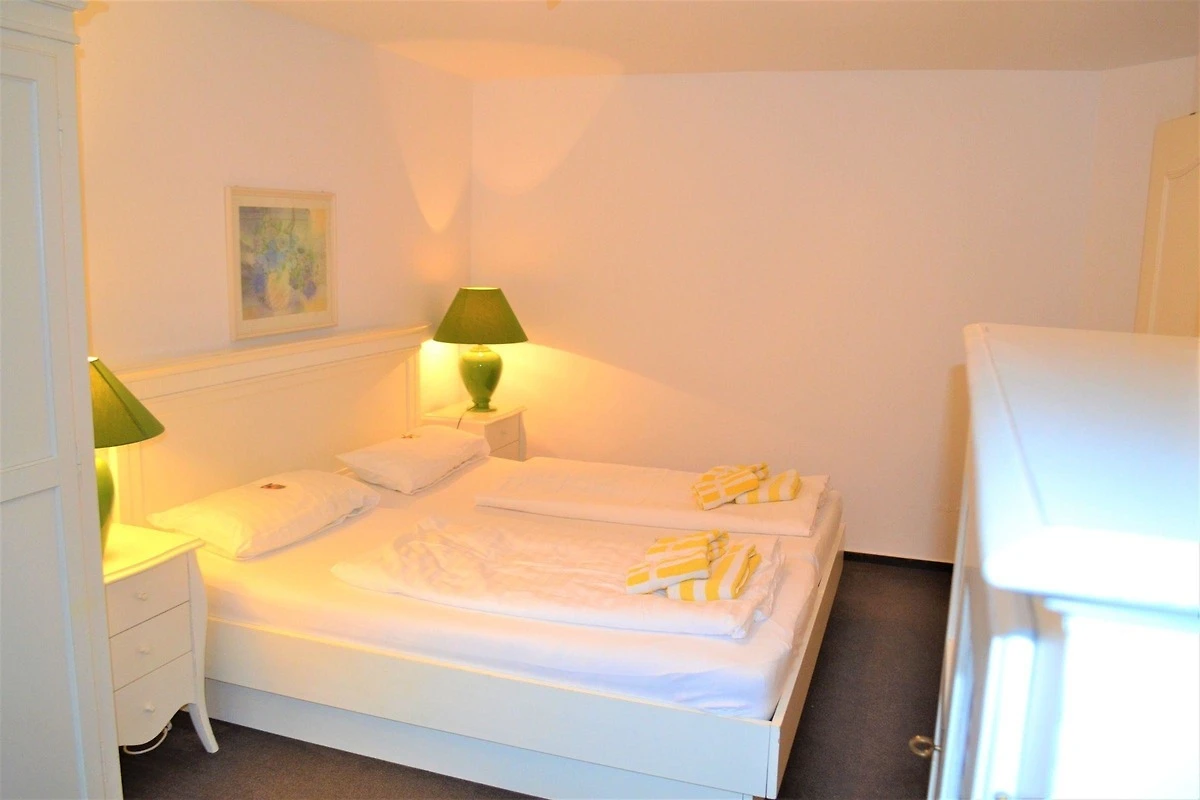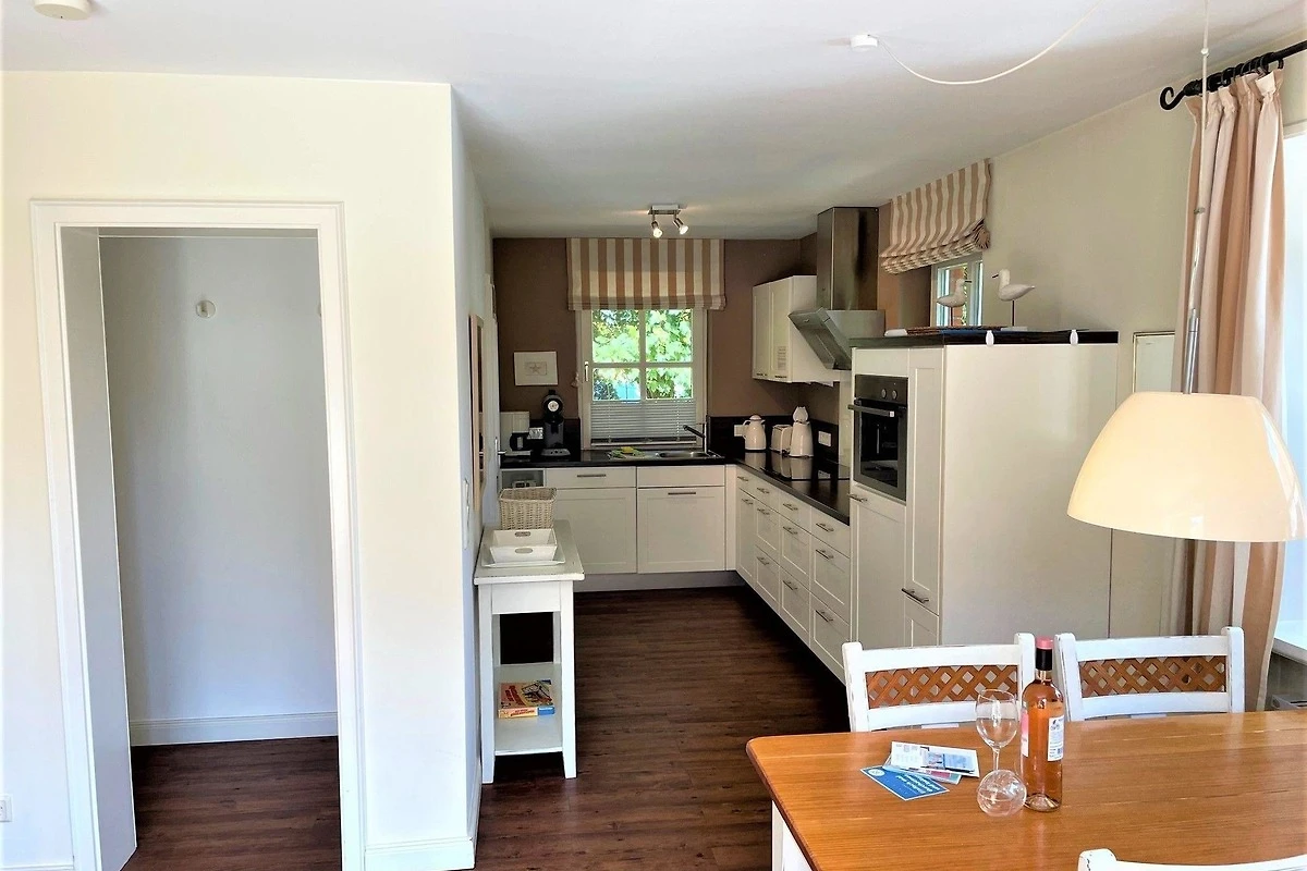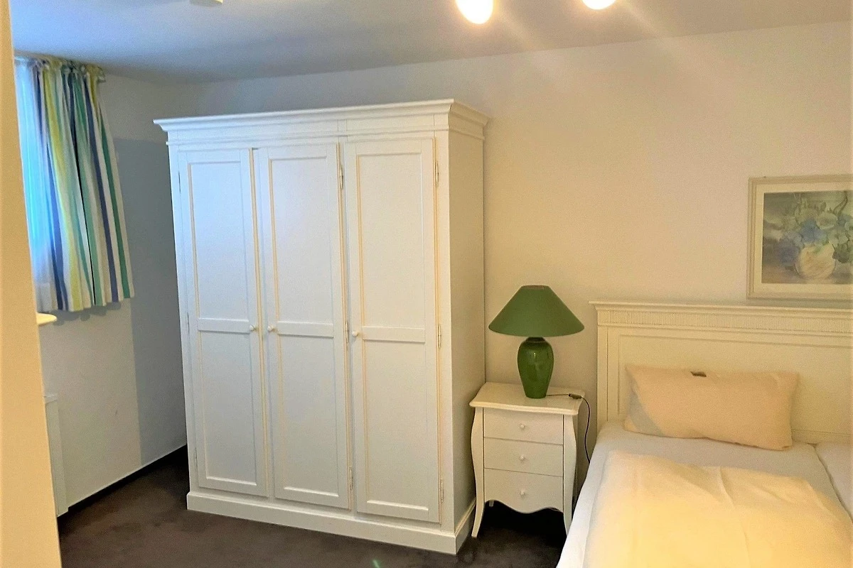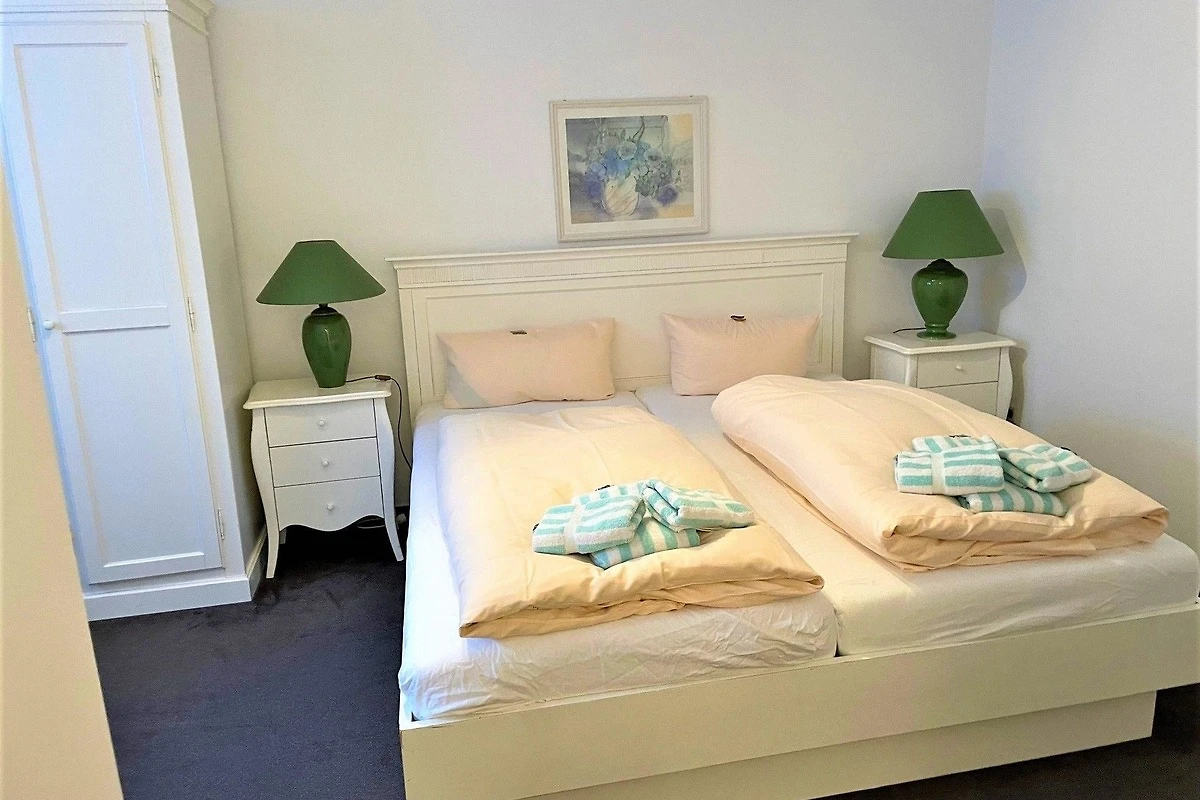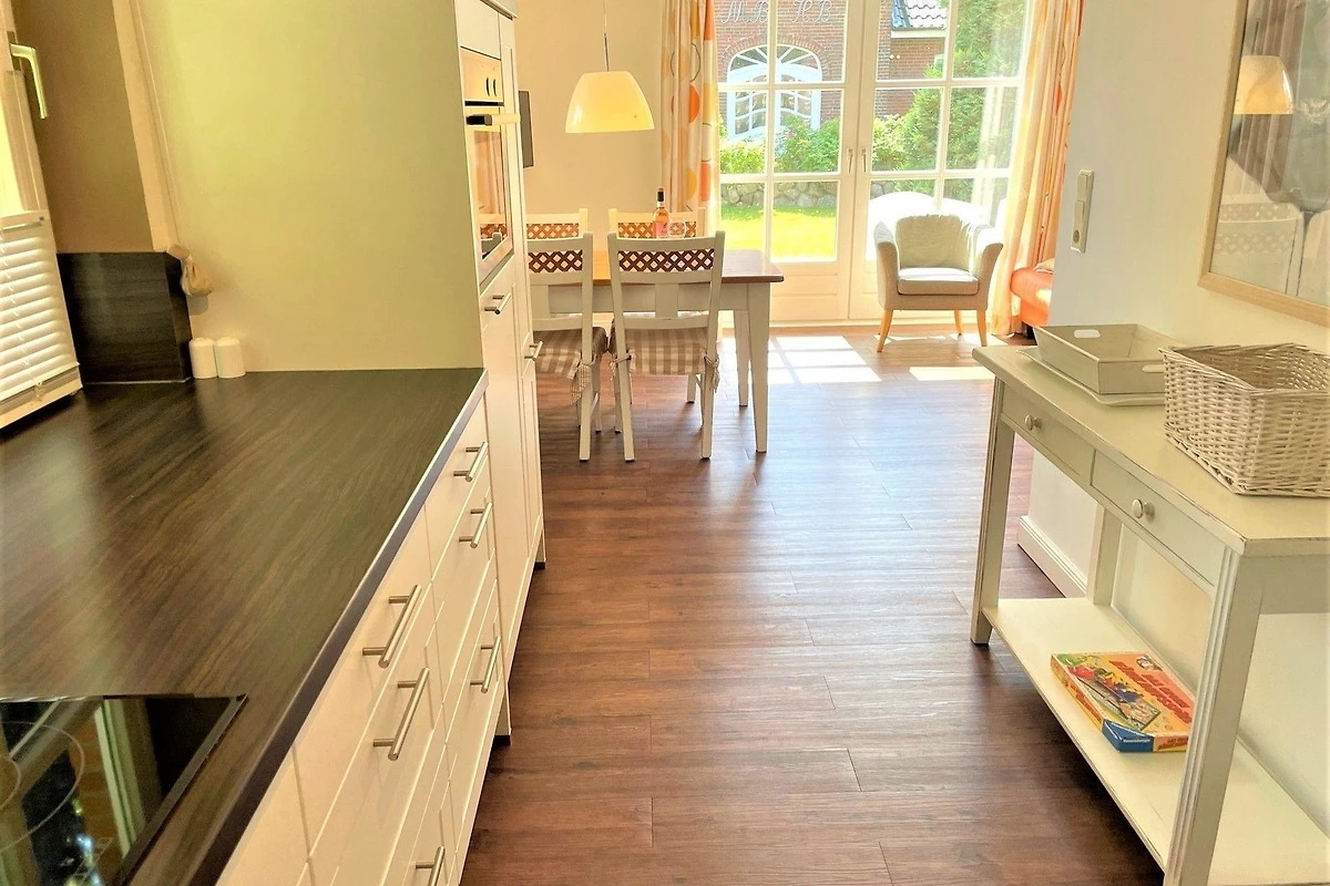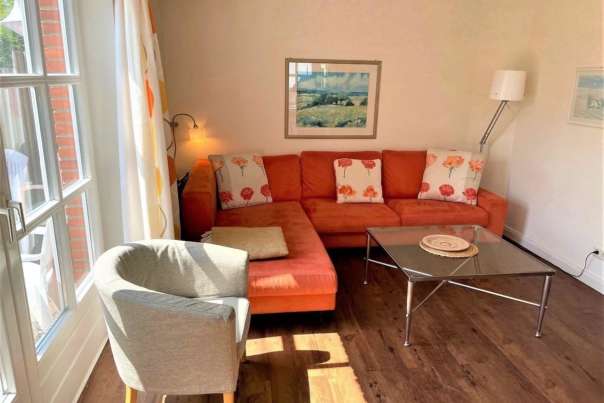 Das Ferienquartier 'Sonnengruss' bietet eine komfortable Nichtraucher-Wohnung in zentraler, strandnaher Lage in Wyk. Im Erdgeschoss befindet sich eine moderne Einbauküche, ausgestattet mit einem Geschirrspüler, Heissluftherd und Ceranfeld. Der geräumige Wohnbereich verfügt über ein bequemes Sofa sowie SAT-TV und Radio. Vom Wohnzimmer aus besteht direkter Zugang zur sonnigen Süd-Ost-Terrasse. Der Schlafraum ist im Souterrain gelegen, was eine ruhige Atmosphäre schafft. Zudem steht ein abschliessbarer Fahrradabstellraum zur Verfügung, ebenso wie ein PKW-Stellplatz. Gäste werden darauf hingewiesen, dass das Laden von Elektroautos mit dem Hausstrom untersagt ist.