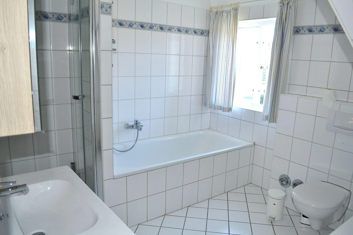 Die hochwertig eingerichtete Doppelhaushälfte bietet auf rund 125 m² Wohnfläche Platz für bis zu 7 Erwachsene und ein Kleinkind. Im Untergeschoss befinden sich eine finnische Sauna, ein Duschbad-WC sowie ein Hauswirtschaftsraum mit Waschmaschine und Trockner. Das Erdgeschoss beherbergt eine Eingangsdiele, ein Gäste-WC und eine moderne Einbauküche, die mit einem Ceran-/Induktionsfeld und Mikrowelle ausgestattet ist. Angrenzend lädt eine gehobene Esstafel für bis zu 8 Personen sowie ein gemütlicher Wohnbereich zum Verweilen ein. In der ersten Etage stehen drei Schlafräume zur Verfügung, darunter zwei mit Doppelbetten und ein Kinderzimmer. Ein weiteres Wannen-/Duschbad-WC ist ebenfalls vorhanden. Auf jeder Etage befindet sich ein TV-Gerät, und eine offene Galerie bietet Platz zum Lesen oder Entspannen. Wäschepakete sind gegen Gebühr erhältlich. Parkmöglichkeiten sind auf dem Grundstück vorhanden.
