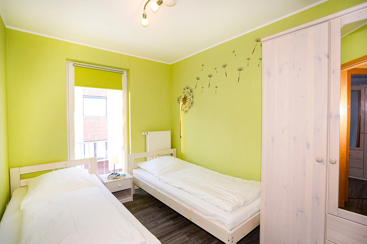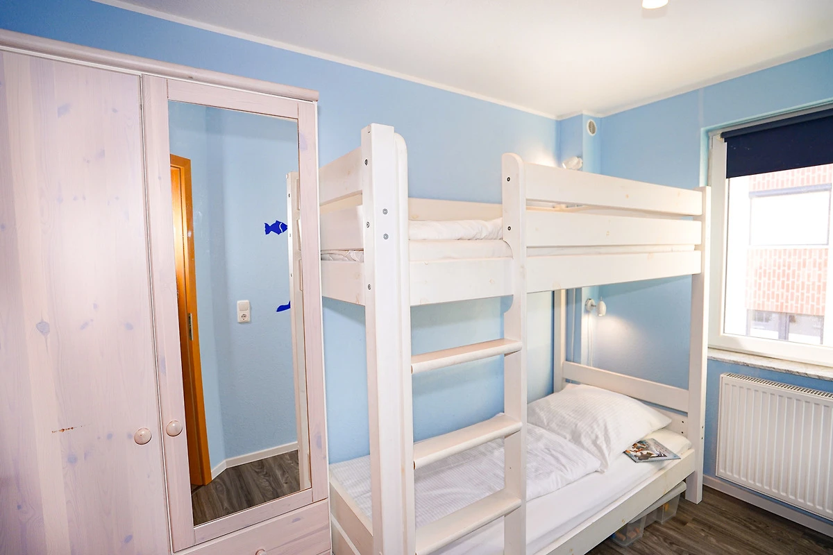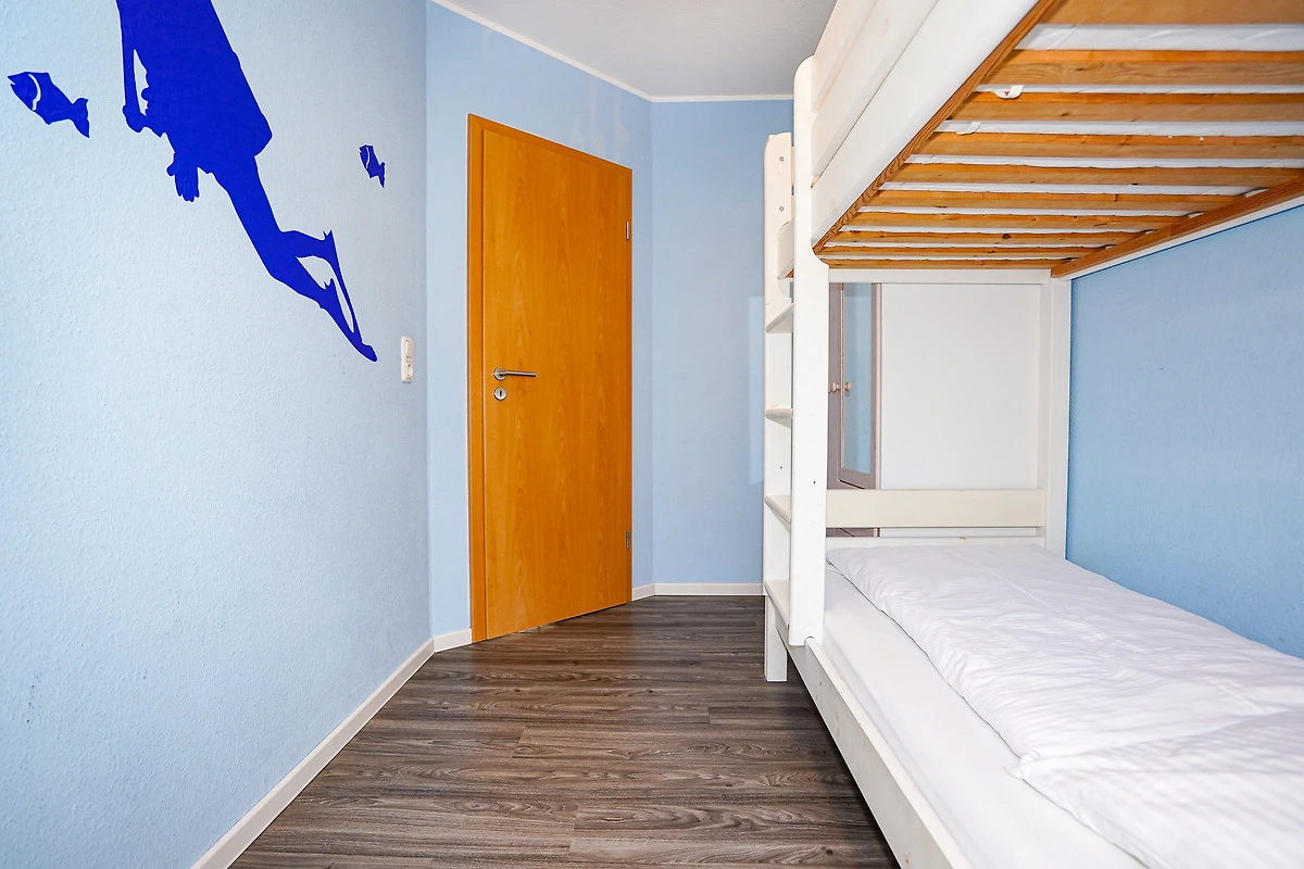 Das Hauptschlafzimmer im 1.OG verfügt über ein Doppelbett (2x90x200cm), einen Fernseher und einen grossen Kleiderschrank. Die bodentiefen Fenster lassen bereits zum Morgen die ersten Sonnenstrahlen rein. Ein zweites Schlafzimmer ist mit zwei Einzelbetten und ebenfalls einem Kleiderschrank ausgestattet. Im dritten Schlafzimmer finden Sie ein Hochbett sowie einen Kleiderschrank vor. Alle Fenster lassen sich durch Rollos verdunkeln.