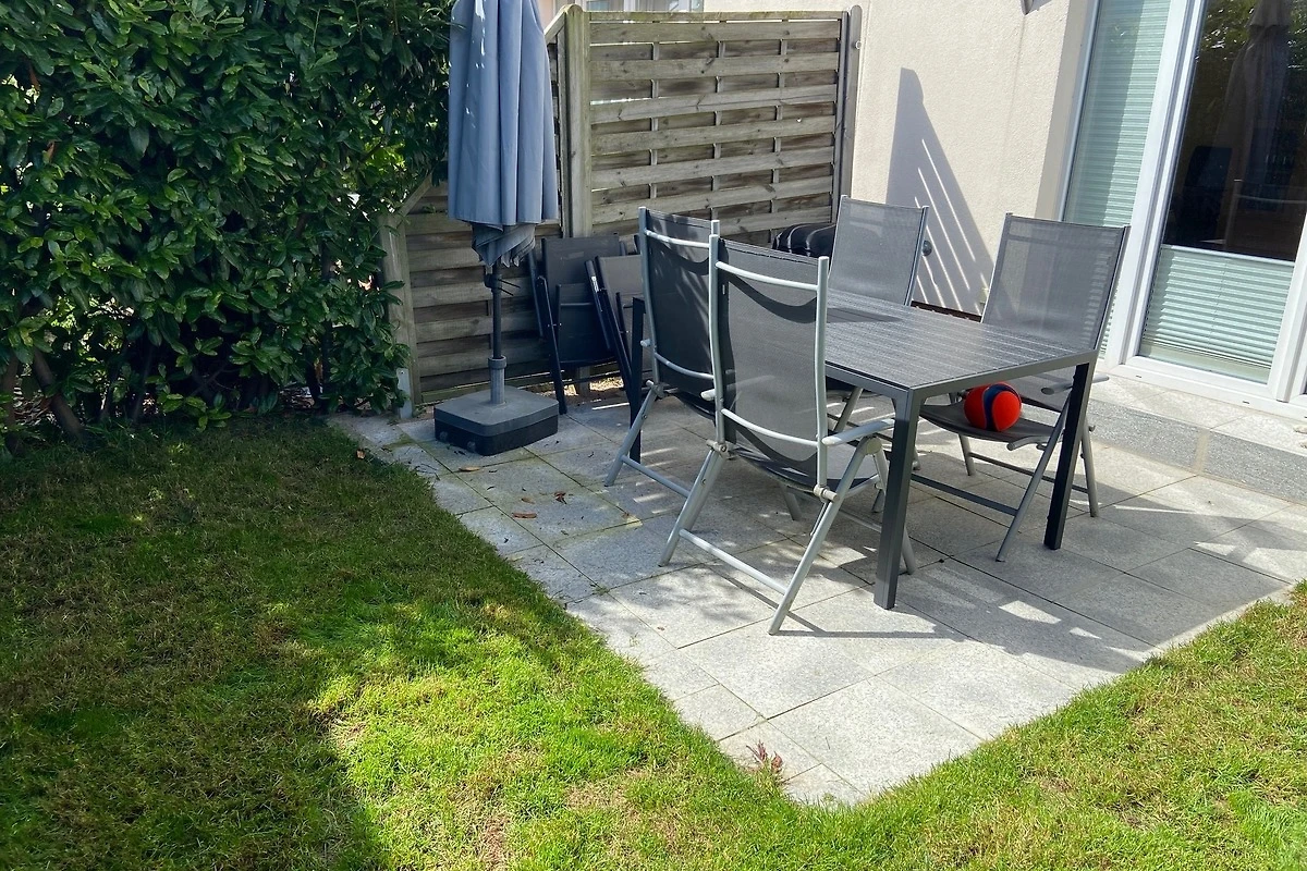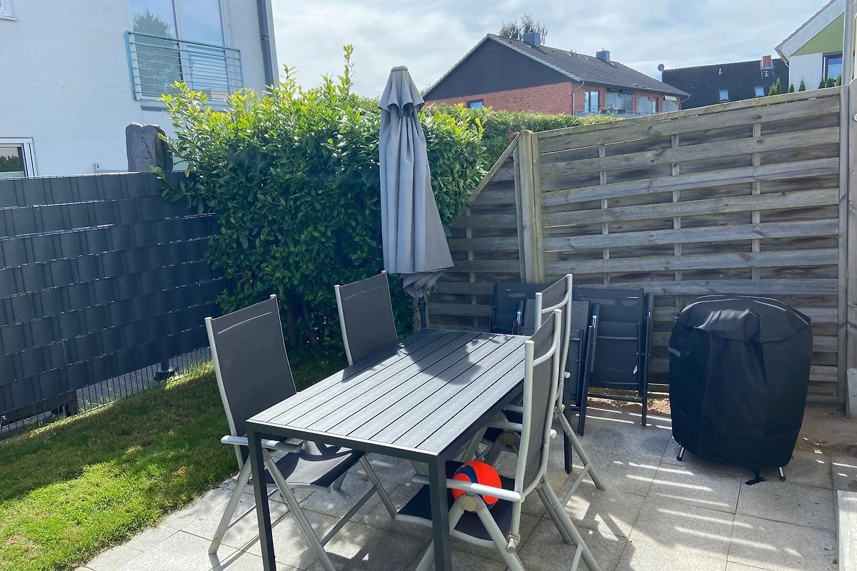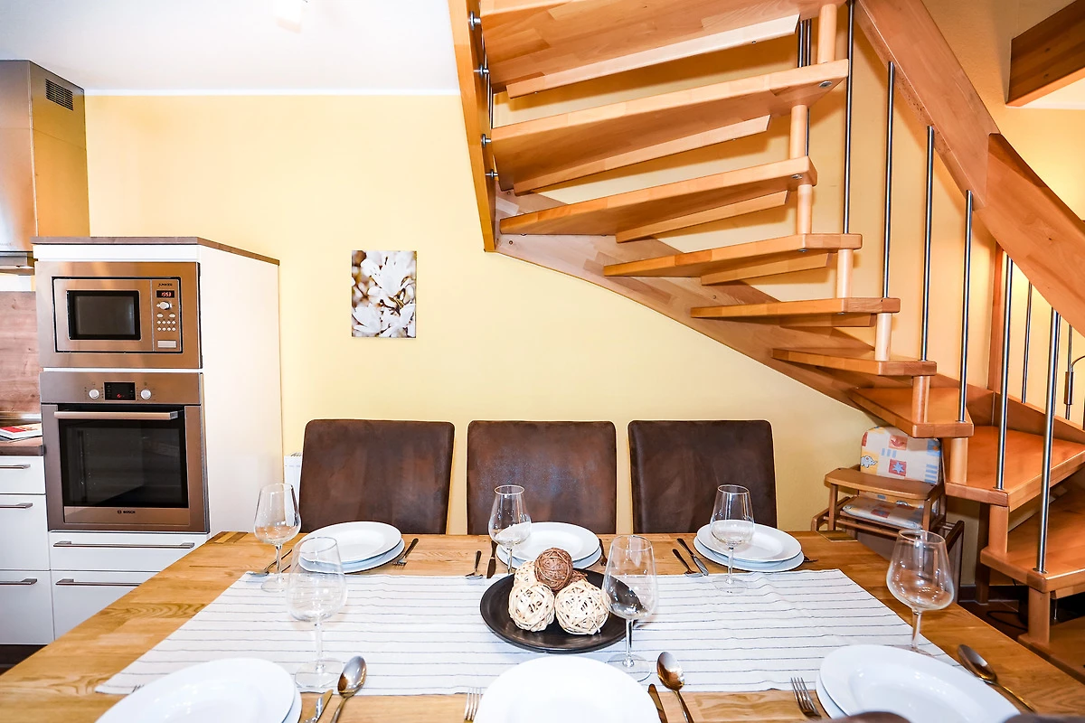 Das modern ausgestattete helle Wohn- und Esszimmer hat einen direkten Zugang zur Terrasse und ist mit einer gemütlichen Eckcouch, einem Sessel, einem grossen Esstisch und einer Vitrine ausgestattet. Zur Unterhaltung stehen ein grosser Flachbildfernseher, eine Mini-Stereoanlage und selbstverständlich kostenloses W-LAN zur Verfügung. Ein Holzkohlegrill auf der Terrasse lädt zum gemütlichen Grillen ein.