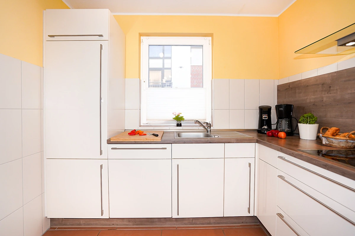 Die offene Küche im Erdgeschoss verfügt über ein 4-Zonen-Cerankochfeld, Backofen, Kühlschrank mit Gefrierfach, Mikrowelle und Spülmaschine.