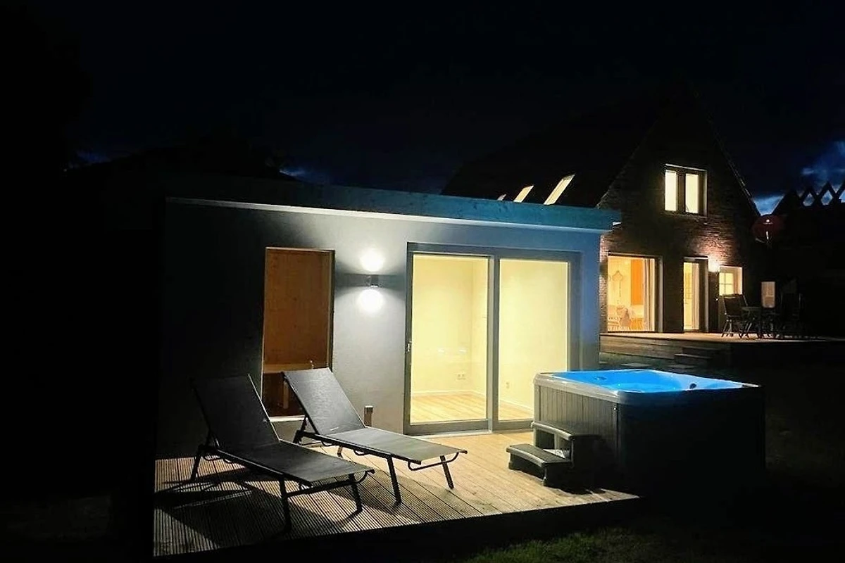 In dem grossen Garten, den sich die beiden Haushälften teilen, befindet sich ein separates Saunahaus und ein Aussen-Whirlpool. Hier lässt es sich herrlich entspannen und dabei in die Ferne schweifen. Vor allem auch in Herbst und Winter ist die wohlige Wärme nach einem ausgedehnten Küstenspaziergang einfach unglaublich wohltuend.