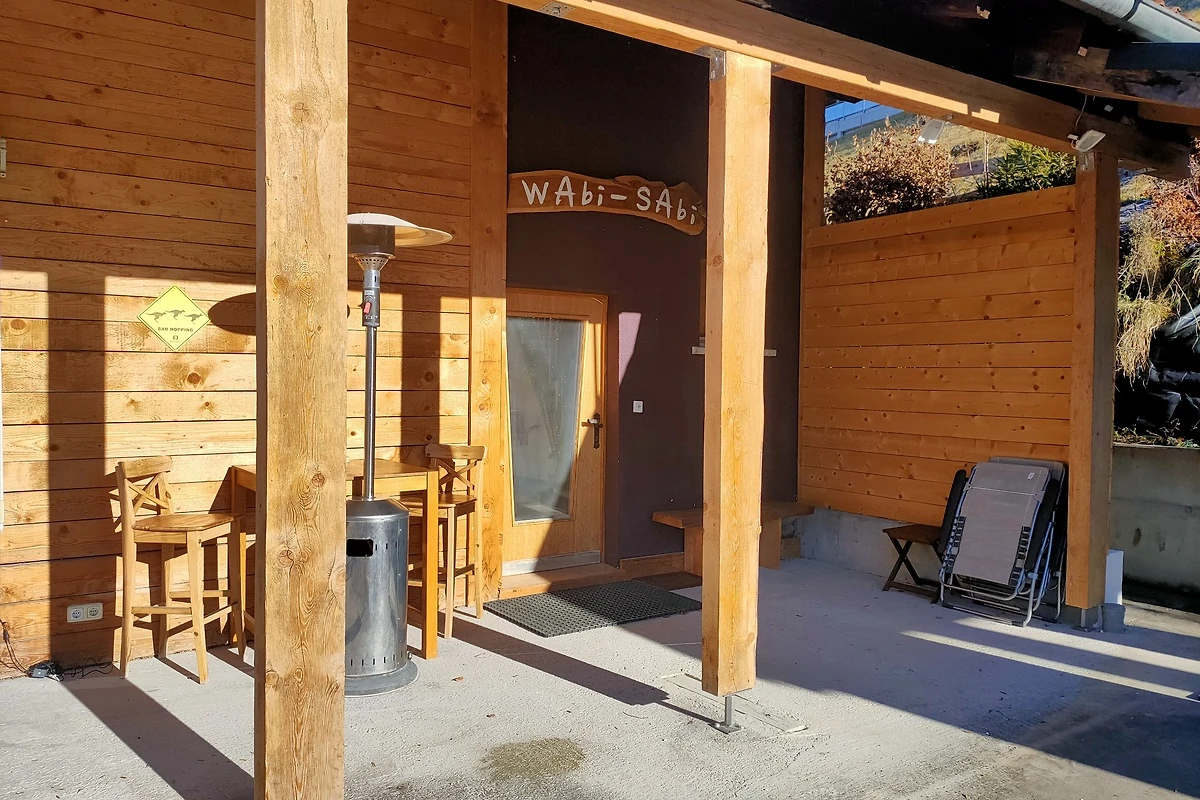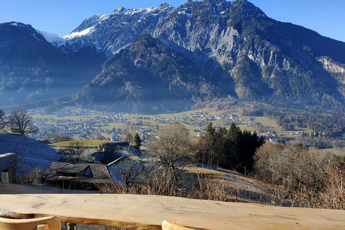 Auf der großen Terrasse mit Blick ins Tal kann man den Tag hervorragend ausklingen lassen. Wir waren zum Ski fahren da, nach St. Gallenkirch sind es 15 Autominuten.