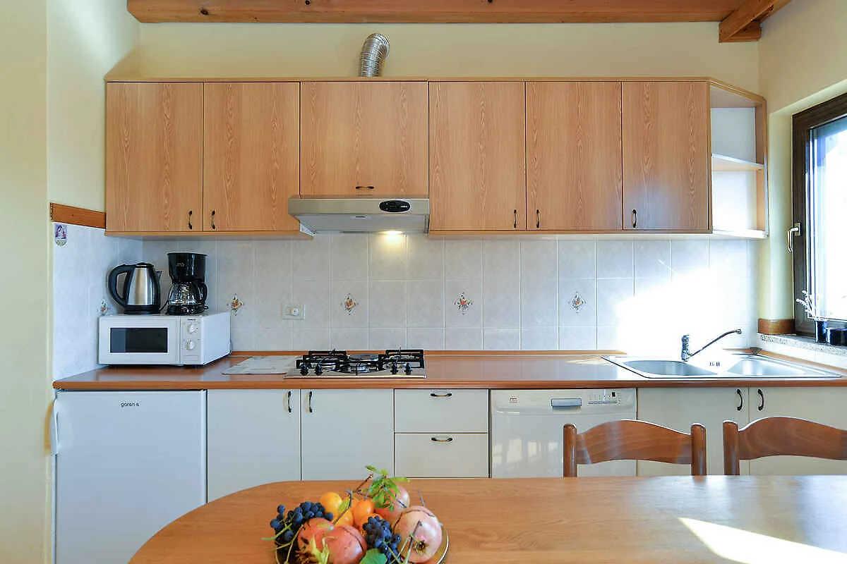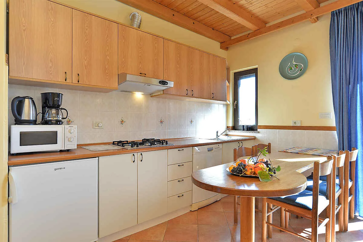 Wohnzimmer (Durchgangszimmer) mit 1 Einzelbett, Sitzecke, TV und Essecke. Schlafzimmer mit 1 Einzelbett. Schlafzimmer mit 1 Doppelbett. Kochecke im Wohnzimmer mit Gasherd, Dunstabzugshaube, Geschirrspüler, Kühlschrank, Mikrowelle, Kaffeemaschine und elektrischem Wasserkocher. Bad mit Waschmaschine, Dusche und WC.