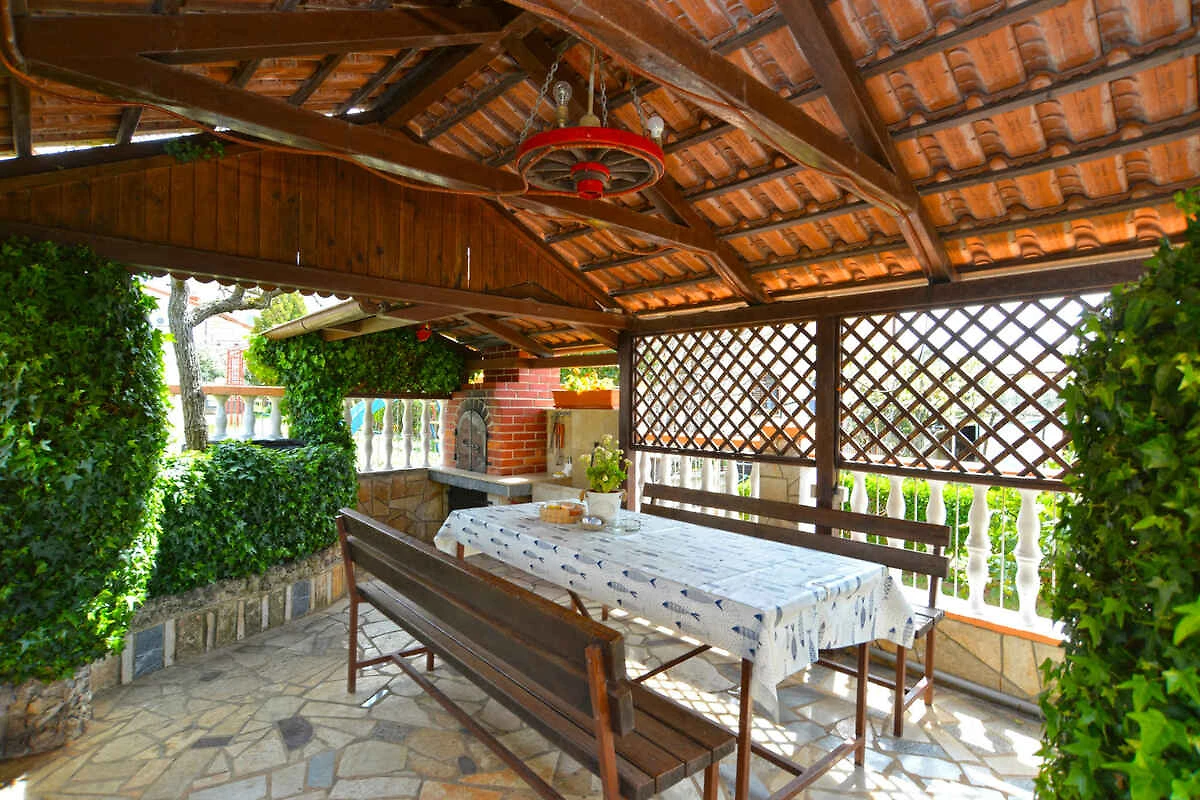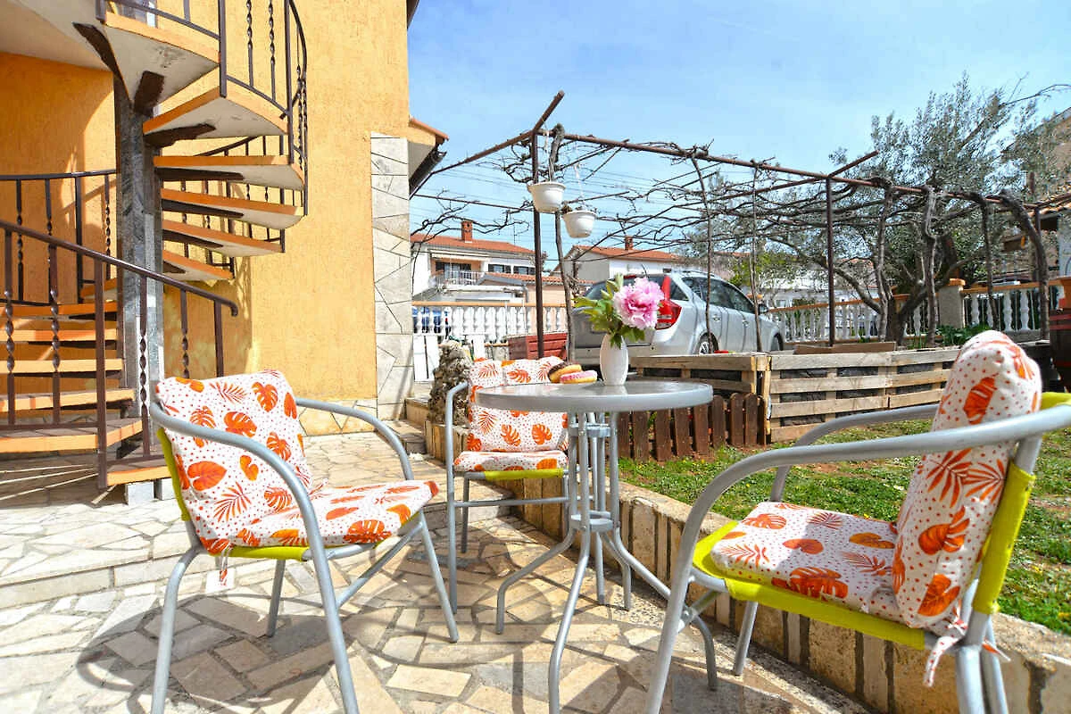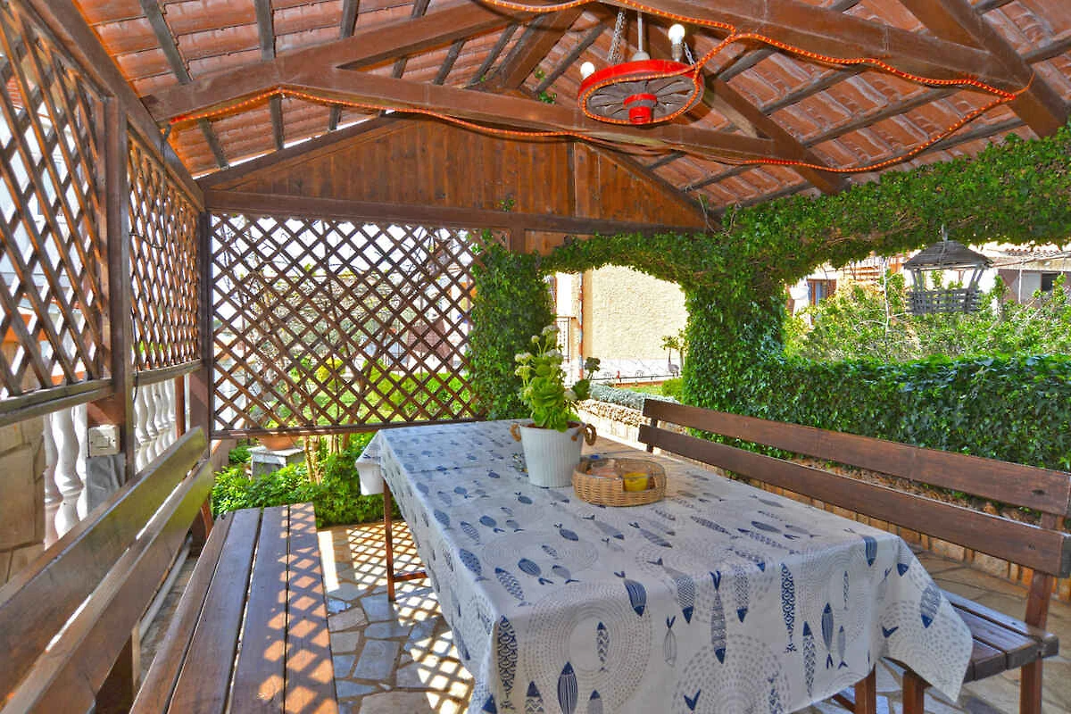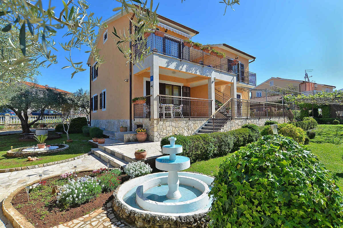 Fažana. Die Ferienwohnung befindet sich auf einem geschlossenen Gartengrundstück mit Wiese, Blumen, Sträuchern und Bäumen, von einem Zaun begrenzt. Der Vermieter wohnt im Haus. Die Zufahrt erfolgt direkt von der Hauptstrasse (asphaltiert). Parkplatz (für 1 Pkw) auf dem Grundstück.