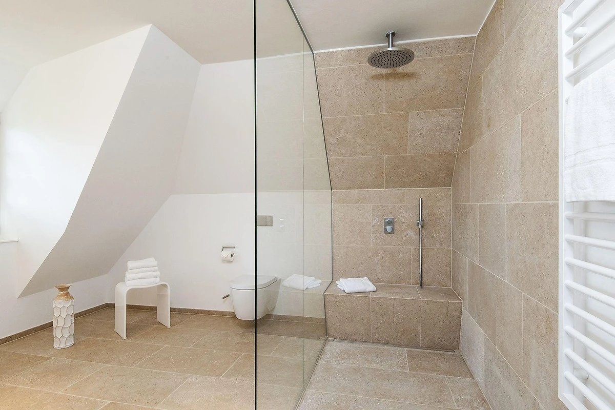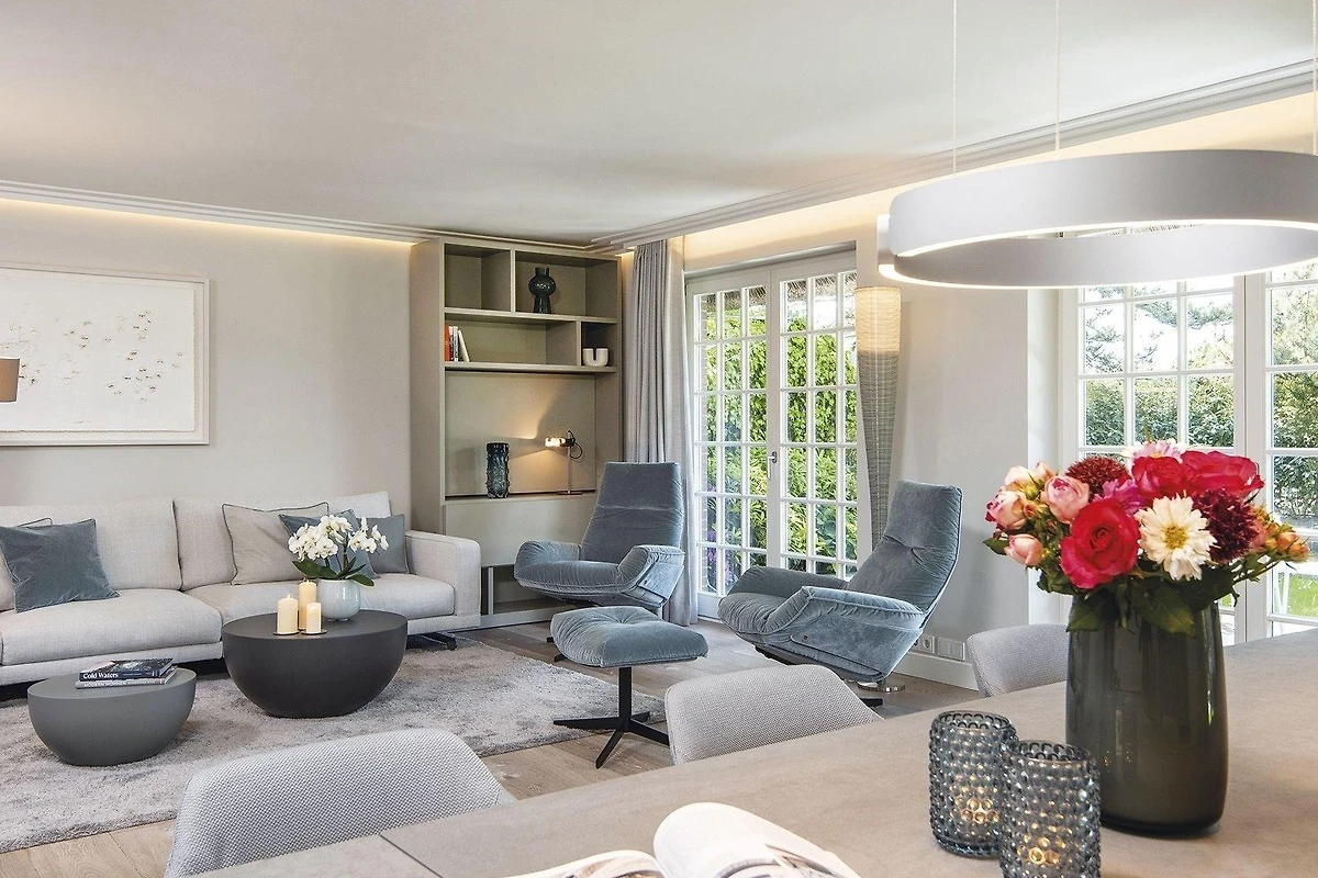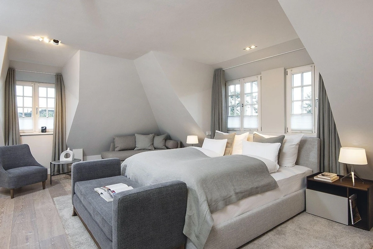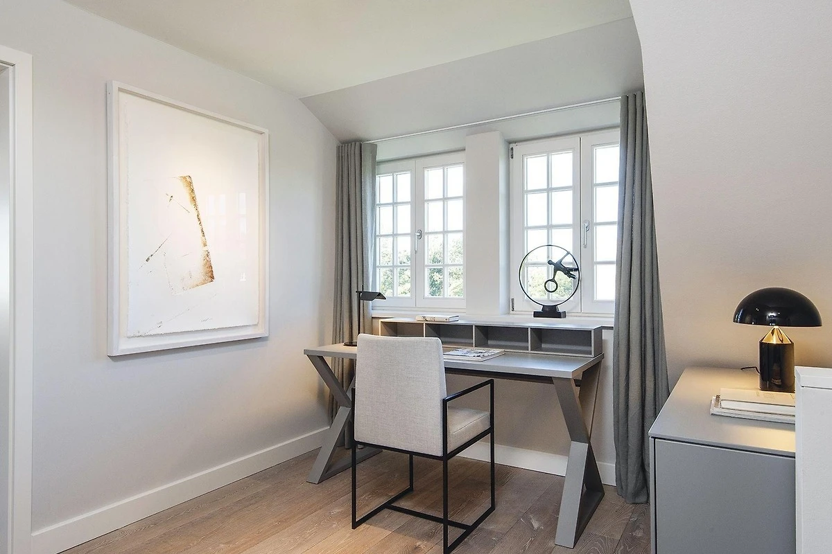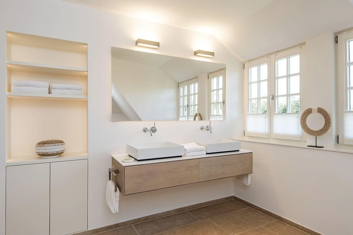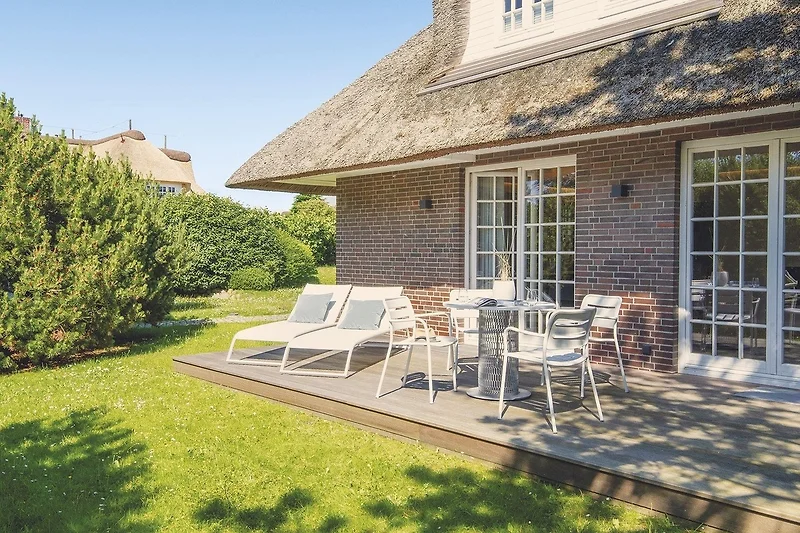 Frisch und luftig ist die Atmosphäre in diesem schönen Hausteil im Süden Kampens. Modernes Ambiente empfängt Sie im Flur. Von hier erreichen Sie den Wohn-Essbereich mit grossem Esstisch, bequemem Loungesofa, Kamin und Zugang zur Südterrasse. Indirekte Beleuchtung und ein elektrischer Kamin sorgen für Gemütlichkeit, wie sie das gesamte Quartier erfüllt. Gegenüber die geräumige voll ausgestattete Küche mit Kochinsel, kleinem Essplatz am Tresen und Zugang zur Frühstücksterrasse. Ebenerdig findet sich noch ein modern eingerichtetes Doppelschlafzimmer und ein hochwertiges Bad mit ebenerdiger Dusche und Doppelwaschbecken. Im Obergeschoss erwartet Sie der Masterbedroom für Zwei, sowie ein geräumiges Bad mit Doppelwaschbecken. Über die Treppe ins Untergeschoss finden Sie zwei Doppelschlafzimmer mit Verbindungstür, eines davon mit privater Souterrain-Terrasse und ein weiteres Bad mit ebenerdiger Dusche und Doppelwaschbecken. Das Highlight dieser Etage ist der grosszügige Wellnessbereich mit geräumiger Sauna, Erlebnisdusche und gemütlicher Relaxinsel, wo sich alle Widrigkeiten des Nordseewetters bestens aushalten lassen. Dieses schöne Hausteil erfüllt alle (Friesen-) Träume!