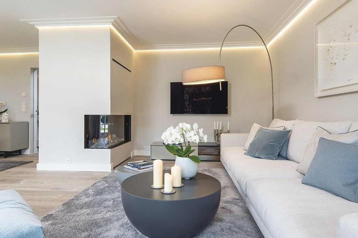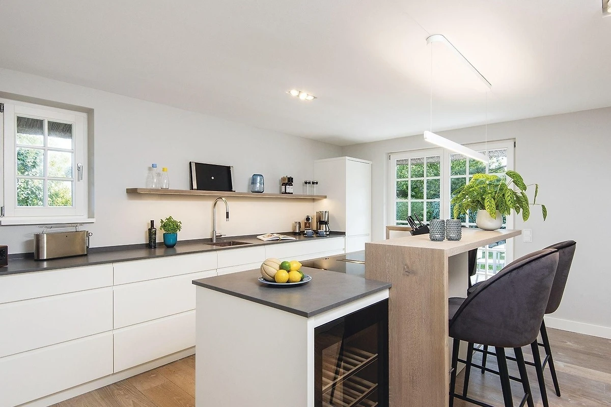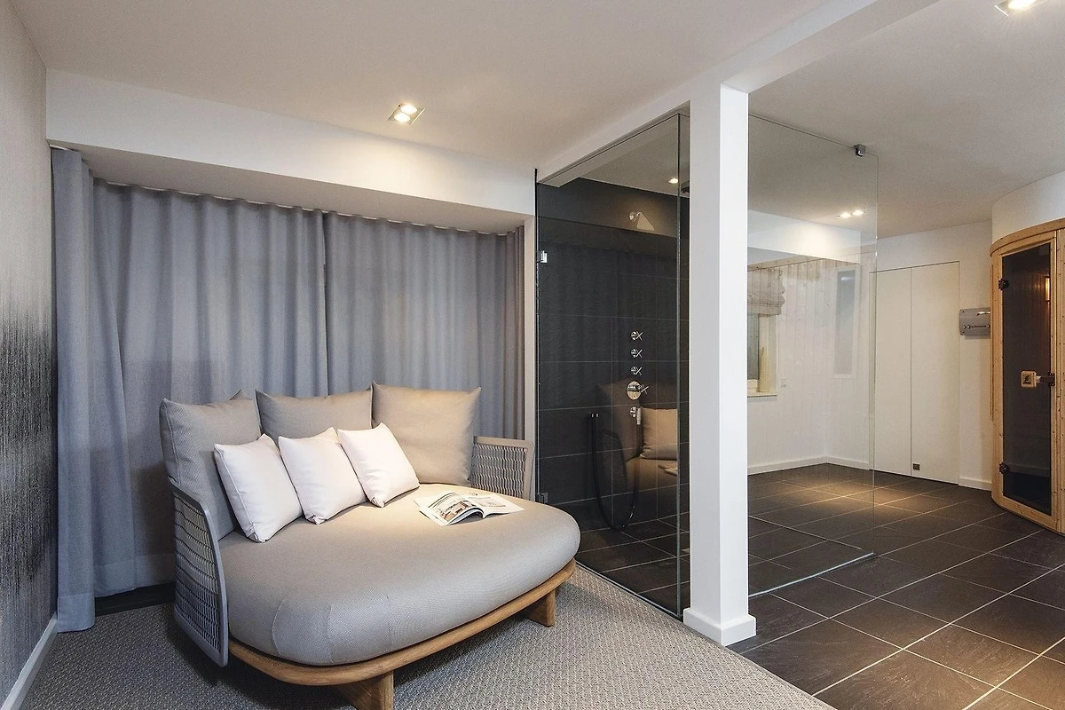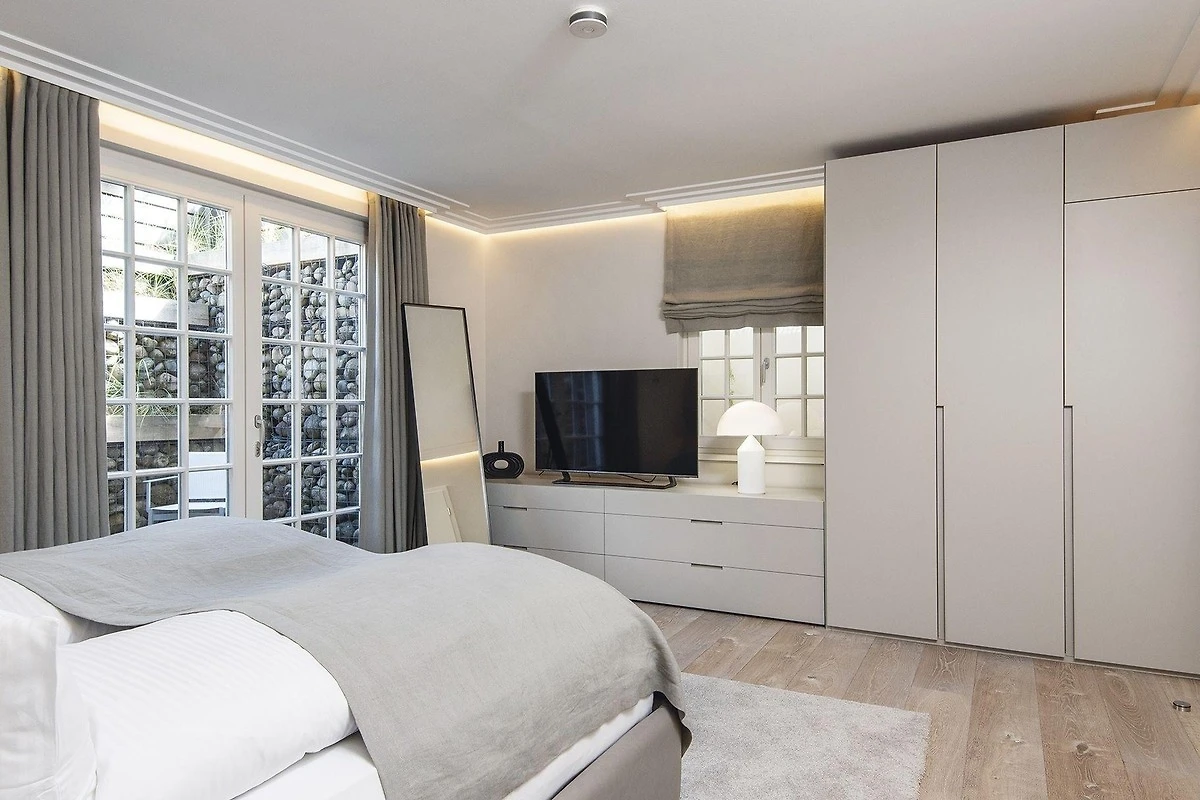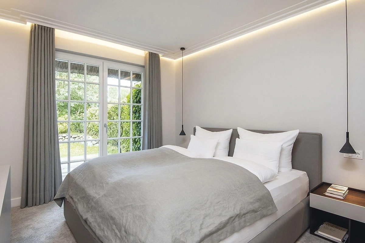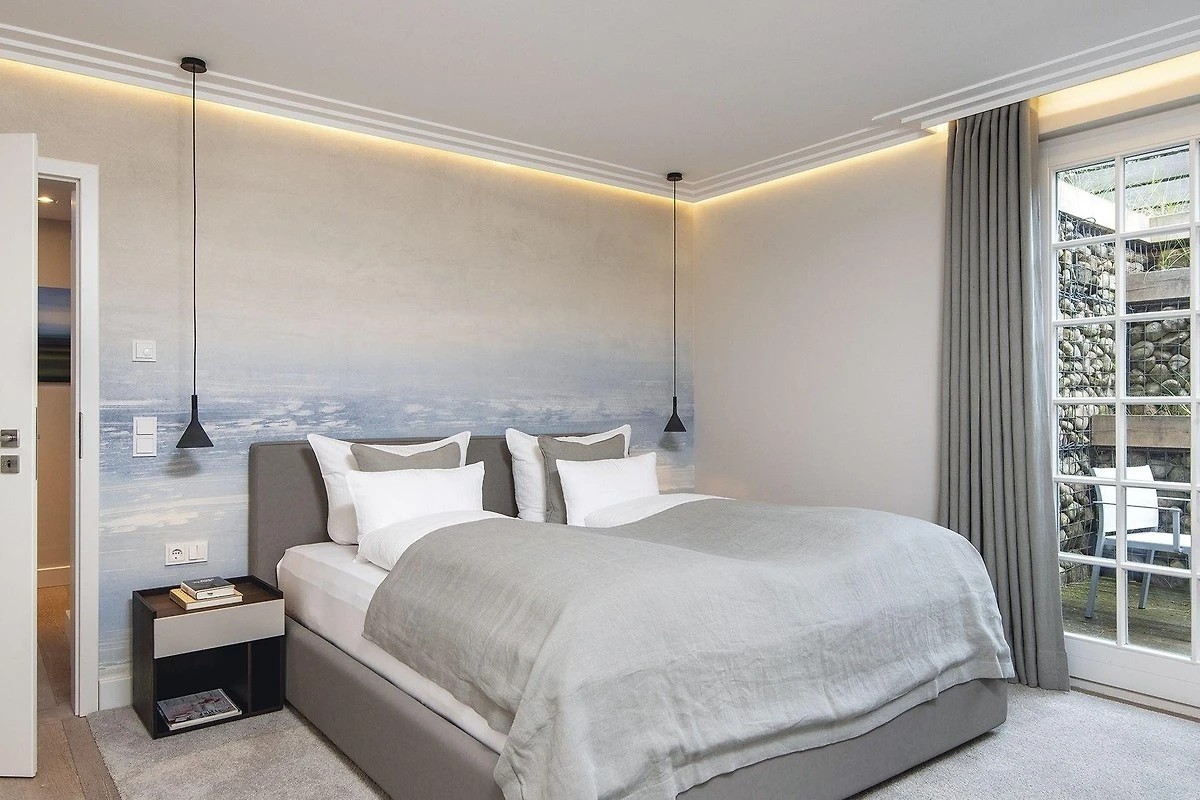 Frisch und luftig ist die Atmosphäre in diesem schönen Hausteil im Süden Kampens. Modernes Ambiente empfängt Sie im Flur. Von hier erreichen Sie den Wohn-Essbereich mit grossem Esstisch, bequemem Loungesofa, Kamin und Zugang zur Südterrasse. Indirekte Beleuchtung und ein elektrischer Kamin sorgen für Gemütlichkeit, wie sie das gesamte Quartier erfüllt. Gegenüber die geräumige voll ausgestattete Küche mit Kochinsel, kleinem Essplatz am Tresen und Zugang zur Frühstücksterrasse. Ebenerdig findet sich noch ein modern eingerichtetes Doppelschlafzimmer und ein hochwertiges Bad mit ebenerdiger Dusche und Doppelwaschbecken. Im Obergeschoss erwartet Sie der Masterbedroom für Zwei, sowie ein geräumiges Bad mit Doppelwaschbecken. Über die Treppe ins Untergeschoss finden Sie zwei Doppelschlafzimmer mit Verbindungstür, eines davon mit privater Souterrain-Terrasse und ein weiteres Bad mit ebenerdiger Dusche und Doppelwaschbecken. Das Highlight dieser Etage ist der grosszügige Wellnessbereich mit geräumiger Sauna, Erlebnisdusche und gemütlicher Relaxinsel, wo sich alle Widrigkeiten des Nordseewetters bestens aushalten lassen. Dieses schöne Hausteil erfüllt alle (Friesen-) Träume!
