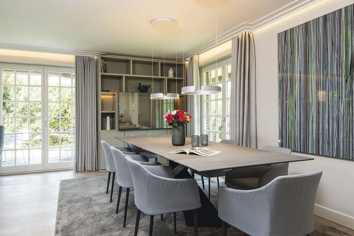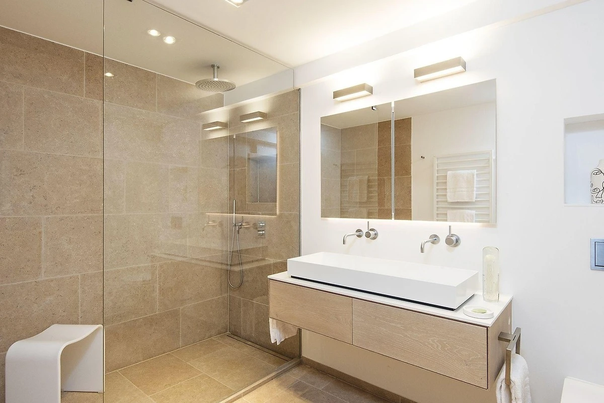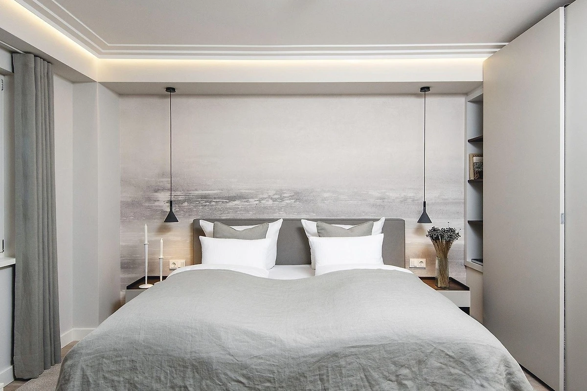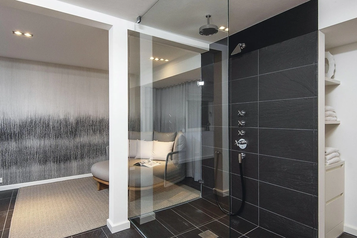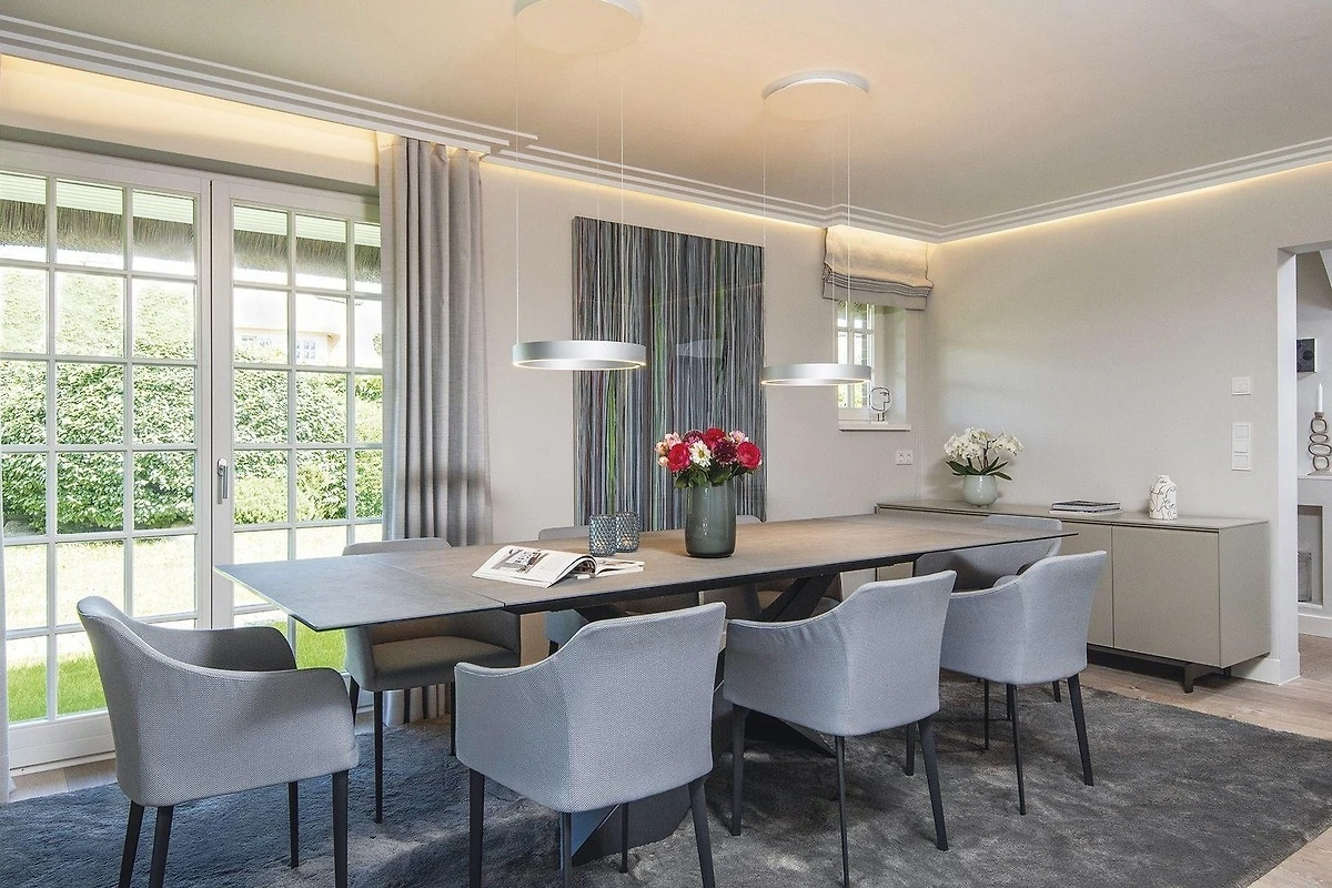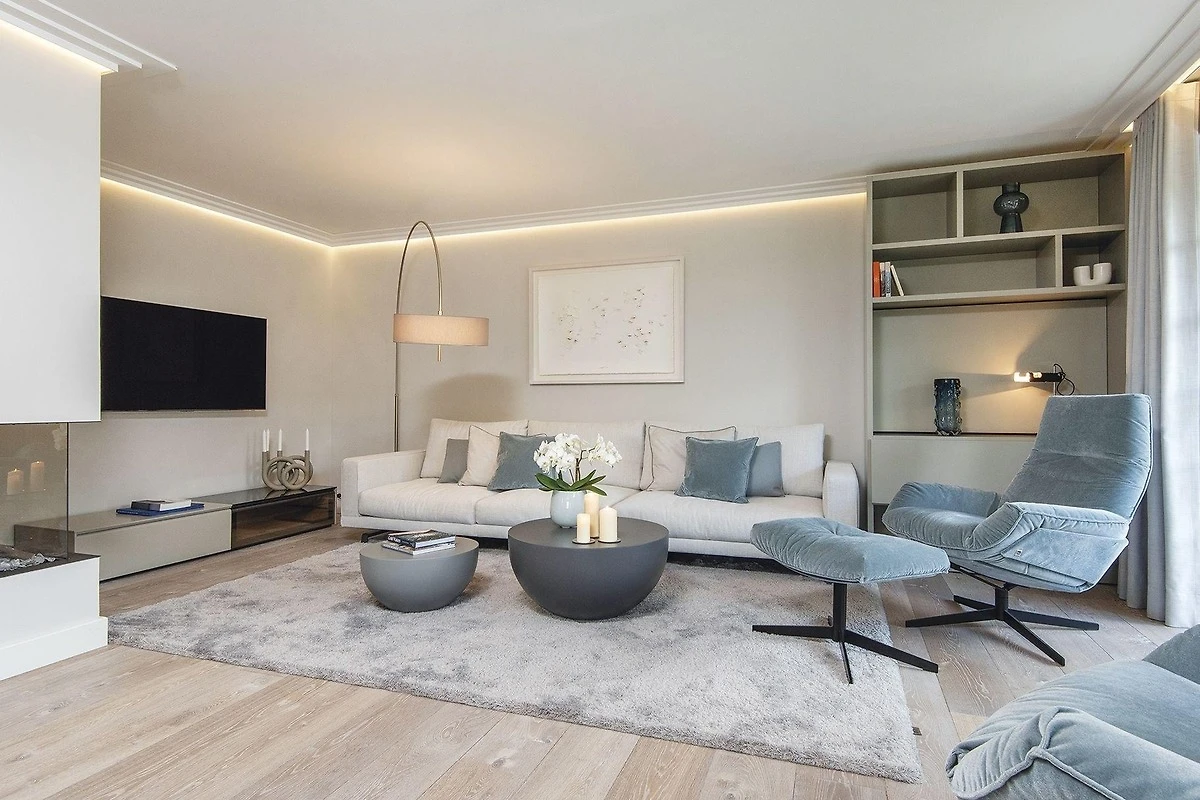 Frisch und luftig ist die Atmosphäre in diesem schönen Hausteil im Süden Kampens. Modernes Ambiente empfängt Sie im Flur. Von hier erreichen Sie den Wohn-Essbereich mit grossem Esstisch, bequemem Loungesofa, Kamin und Zugang zur Südterrasse. Indirekte Beleuchtung und ein elektrischer Kamin sorgen für Gemütlichkeit, wie sie das gesamte Quartier erfüllt. Gegenüber die geräumige voll ausgestattete Küche mit Kochinsel, kleinem Essplatz am Tresen und Zugang zur Frühstücksterrasse. Ebenerdig findet sich noch ein modern eingerichtetes Doppelschlafzimmer und ein hochwertiges Bad mit ebenerdiger Dusche und Doppelwaschbecken. Im Obergeschoss erwartet Sie der Masterbedroom für Zwei, sowie ein geräumiges Bad mit Doppelwaschbecken. Über die Treppe ins Untergeschoss finden Sie zwei Doppelschlafzimmer mit Verbindungstür, eines davon mit privater Souterrain-Terrasse und ein weiteres Bad mit ebenerdiger Dusche und Doppelwaschbecken. Das Highlight dieser Etage ist der grosszügige Wellnessbereich mit geräumiger Sauna, Erlebnisdusche und gemütlicher Relaxinsel, wo sich alle Widrigkeiten des Nordseewetters bestens aushalten lassen. Dieses schöne Hausteil erfüllt alle (Friesen-) Träume!