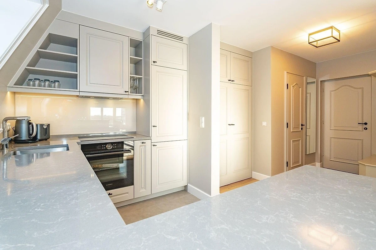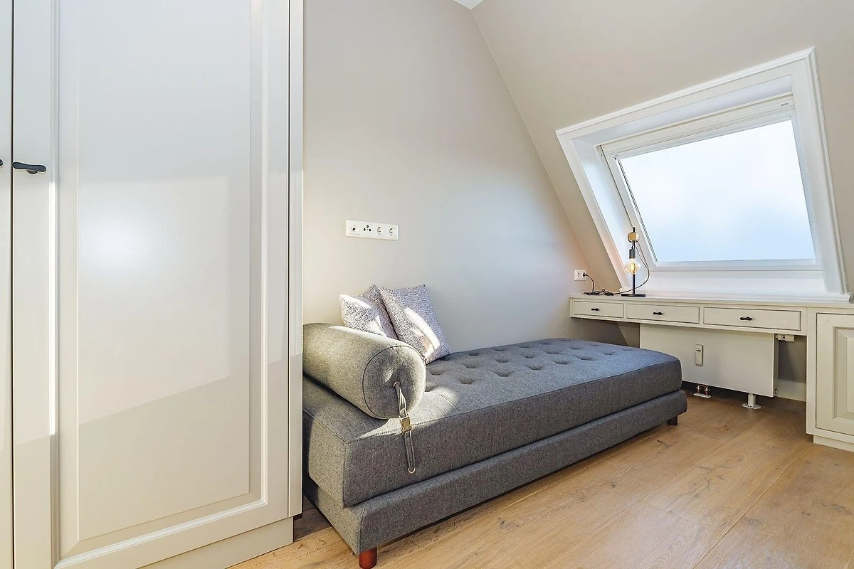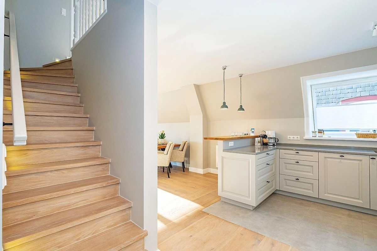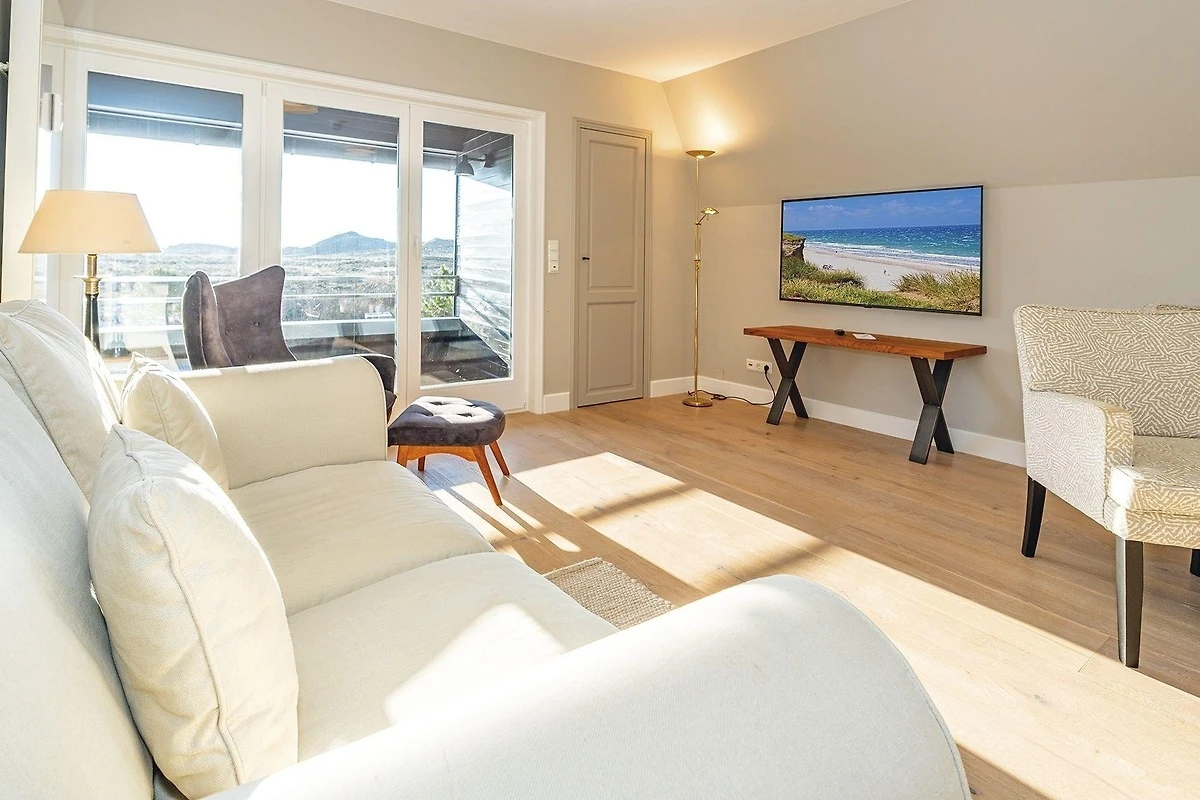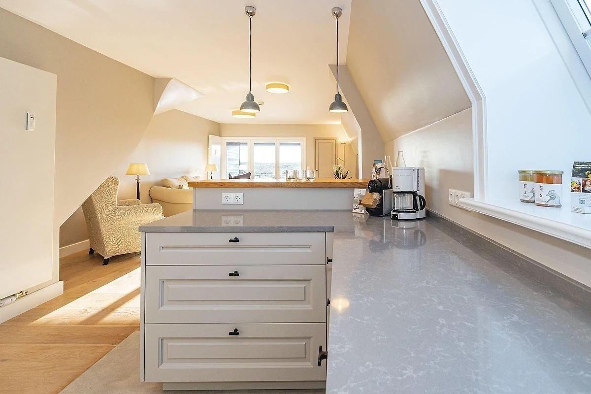 Dieses zauberhafte Quartier für Drei erwartet Sie im 1. OG eines gepflegten Appartementhauses in der Kurhausstrasse. Der Eingangsbereich mit Gäste-WC schliesst direkt an die elegante offene Küche und den kombinierten WohnEssbereich an. Hier überzeugt sofort der tolle Panoramaausblick über die Kampener Heidelandschaft vom Leuchtturm "Langer Christian" bis hin zur Uwe Düne, sowie der gemütlich geschützte Südbalkon. Der gleiche schöne Ausblick erfreut im Einzelschlafzimmer mit französischem Bett und Chaiselongue im Obergeschoss des Quartiers. Ein weiteres Schlafzimmer für Zwei und je ein Dusch- und Wannenbad, sowie hochwertige Tischlereinbauten in einheitlichem Stil komplettieren diese Etage. Das gesamte Quartier ist frisch renoviert und verkörpert eine moderne Interpretation des Landhausstils in Grau- und Weisstönen mit schmuckem Holzfussboden.