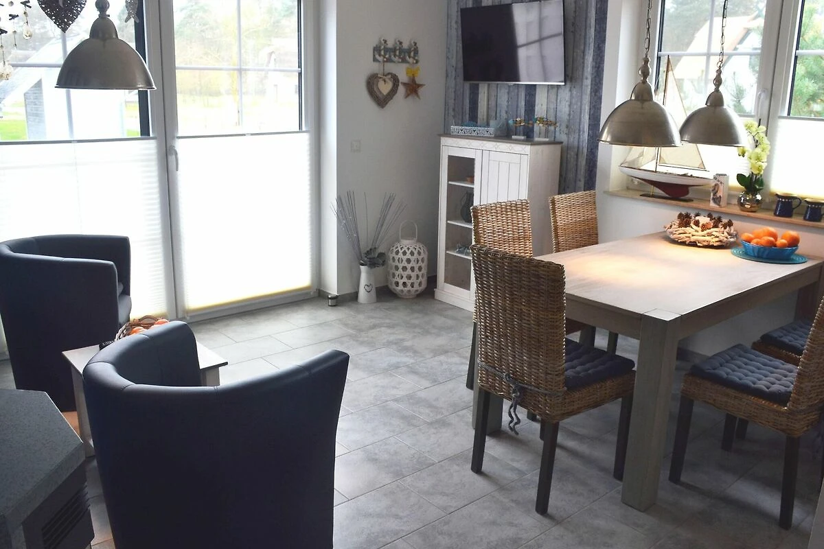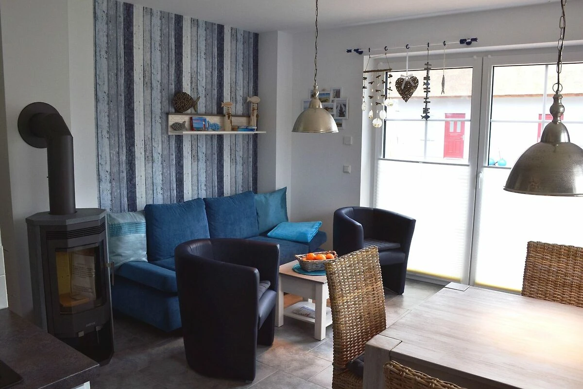 Ein wunderbares Refugium für die schönsten Tage des Jahres: Geschmackvoll und hochwertig eingerichtetes Reetdachhaus mit Kaminofen. Die im Landhausstil eingerichteten Räume des Hauses versprechen Ihnen erholsame und entspannte Tage im Südosten der Insel. Die großzügige Terrasse mit eigenem Strandkord zum Relaxen eignet sich perfekt, um im Freien bei etwas Urlaubslektüre zu entspannen oder um einen gemütlichen Grillabend einzulegen. Wenn das Wäschepaket mitgebucht wird, sind die Betten bei Anreise bereits bezogen.
