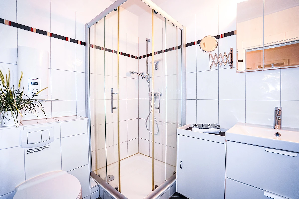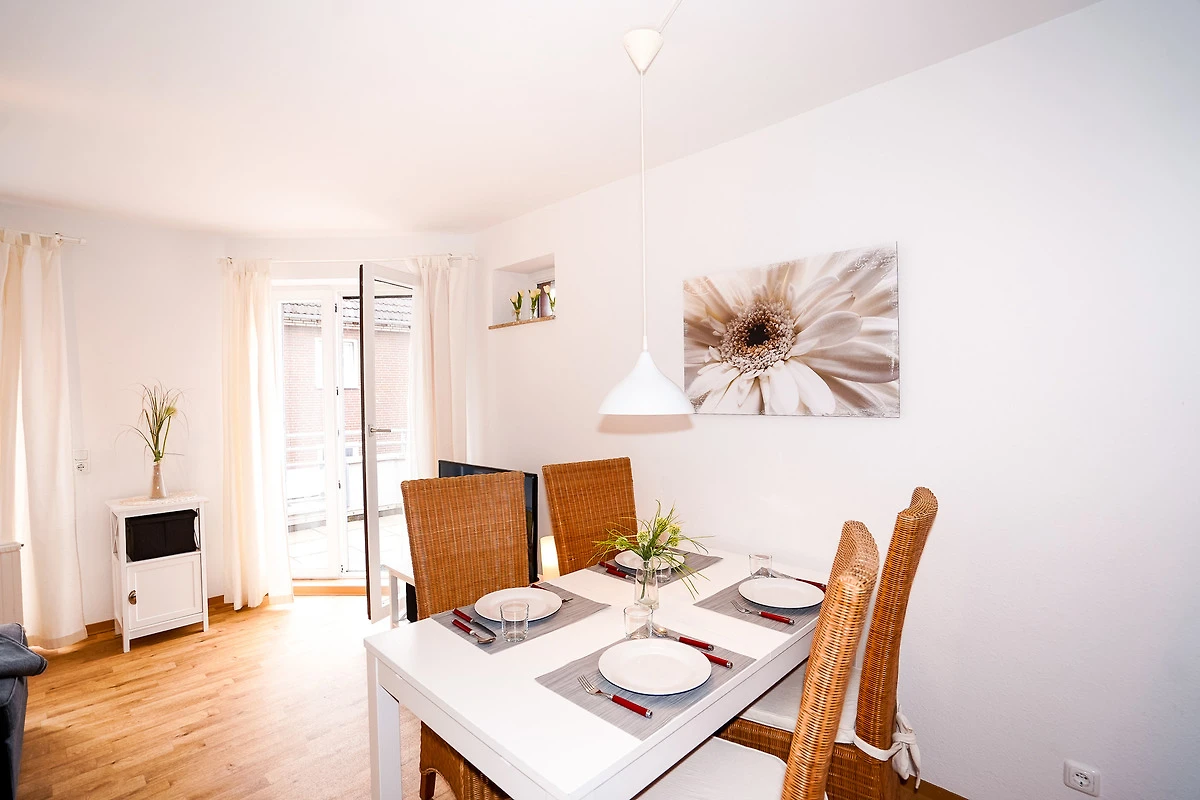 Im Wohn-/Essbereich finden Sie ein Schlafsofa (160x200), einen Tisch mit vier Stühlen, einen Fernsehrer und eine kleine Musikanlage vor. Kostenloses W-LAN ist hier selbstverständlich vorhanden.