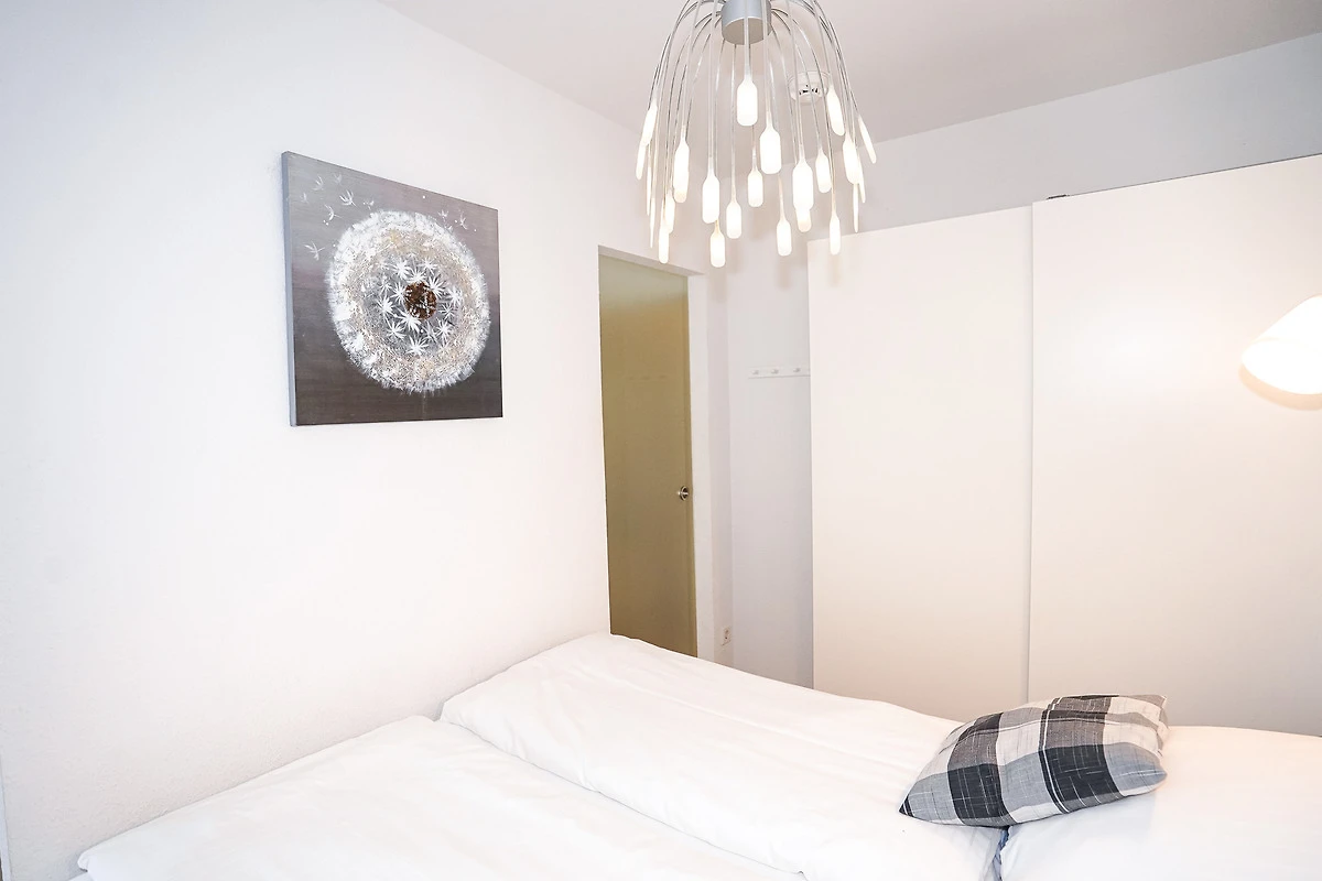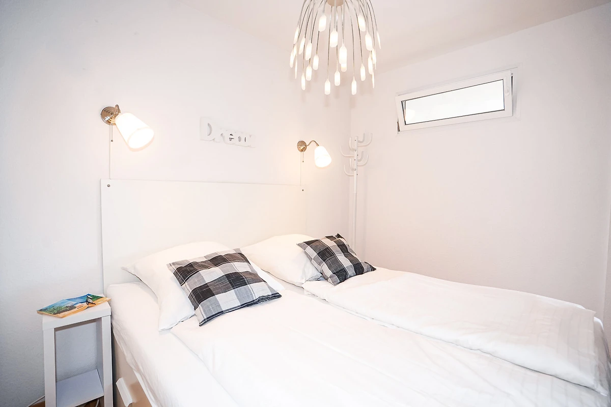 Diese 2-Zimmer-Ferienwohnung bietet ausreichend Platz für 2 Erwachsene und zwei Kinder. Das separate Schlafzimmer ist mit einem bequemen Doppelbett und einem grossen Kleiderschrank ausgestattet.