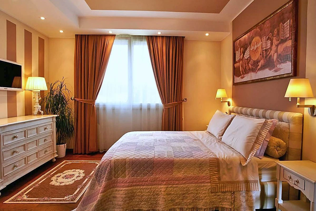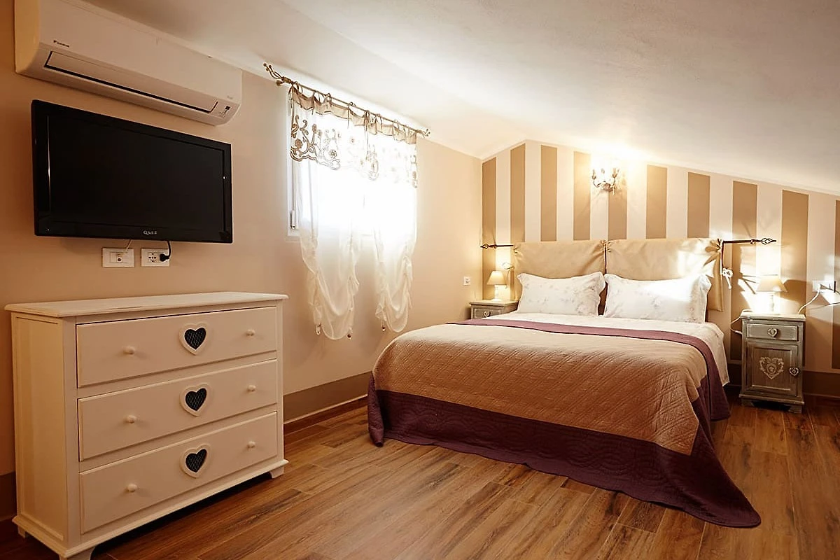 EG: 1 Doppel-Schlafzimmer, das größere mit begehbarem Kleiderschrank, eigenem Travertin-Bad und TV.