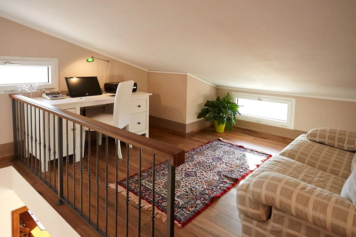 Manchmal soll es auch im Urlaub sein. Im OG ist ein gemütliches Studio mit Schreibtisch, Stuhl und Sofa.