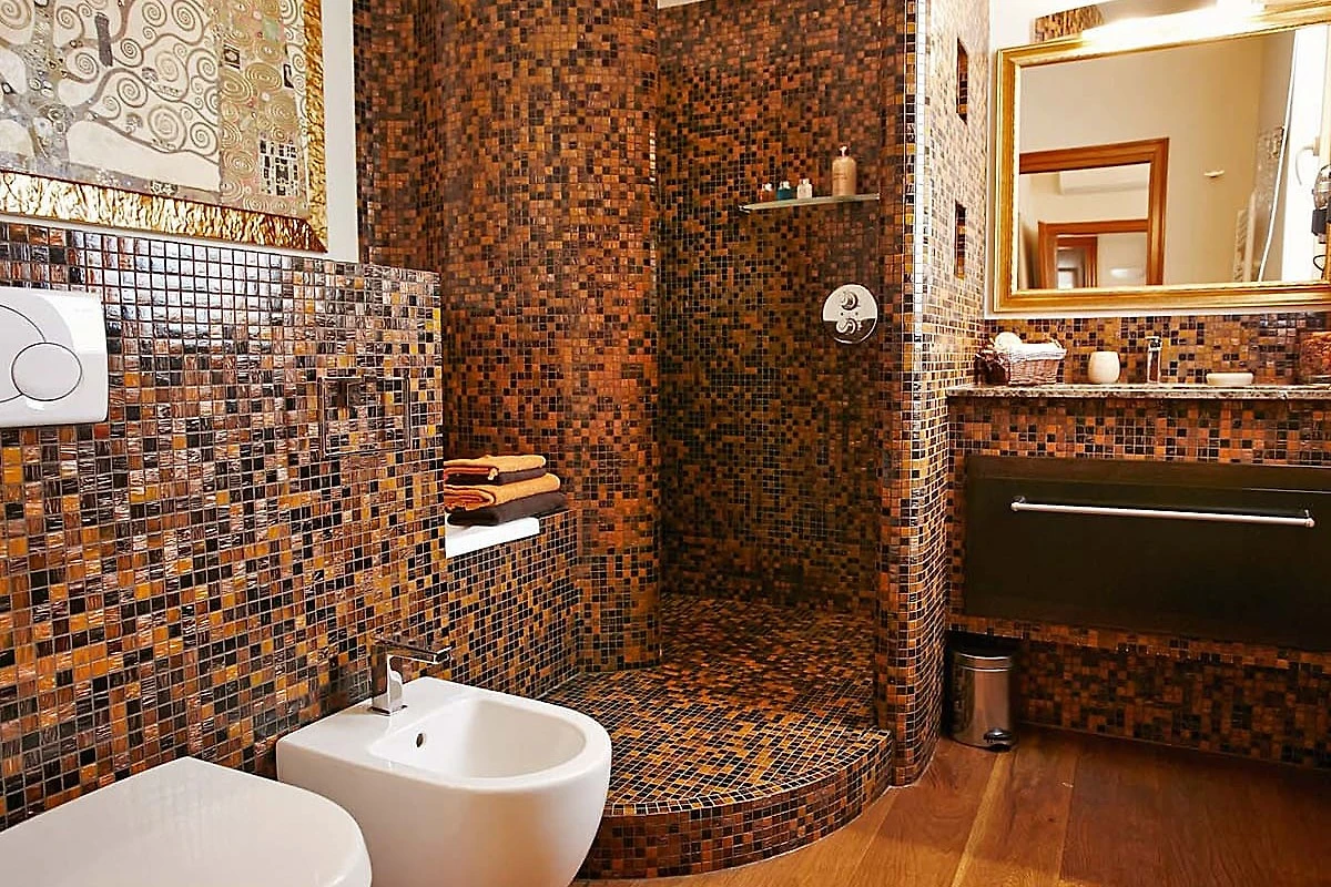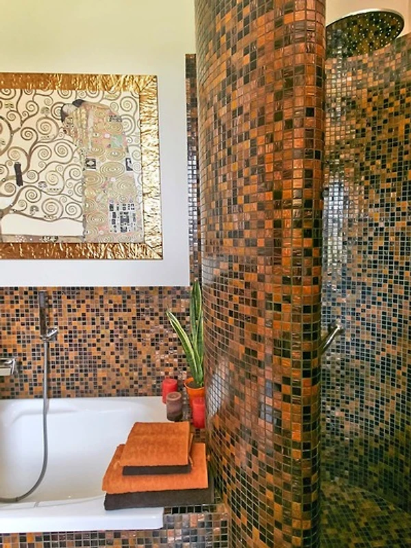 EG: im größeren Schlafzimmer, das Bad mit Fenster bietet eine Badewanne, eine gemauerte Dusche, WC, Bidet und ein Doppelwaschbecken. Das Bad ist mit geschmackvollen Mosaikfliesen gefliest.