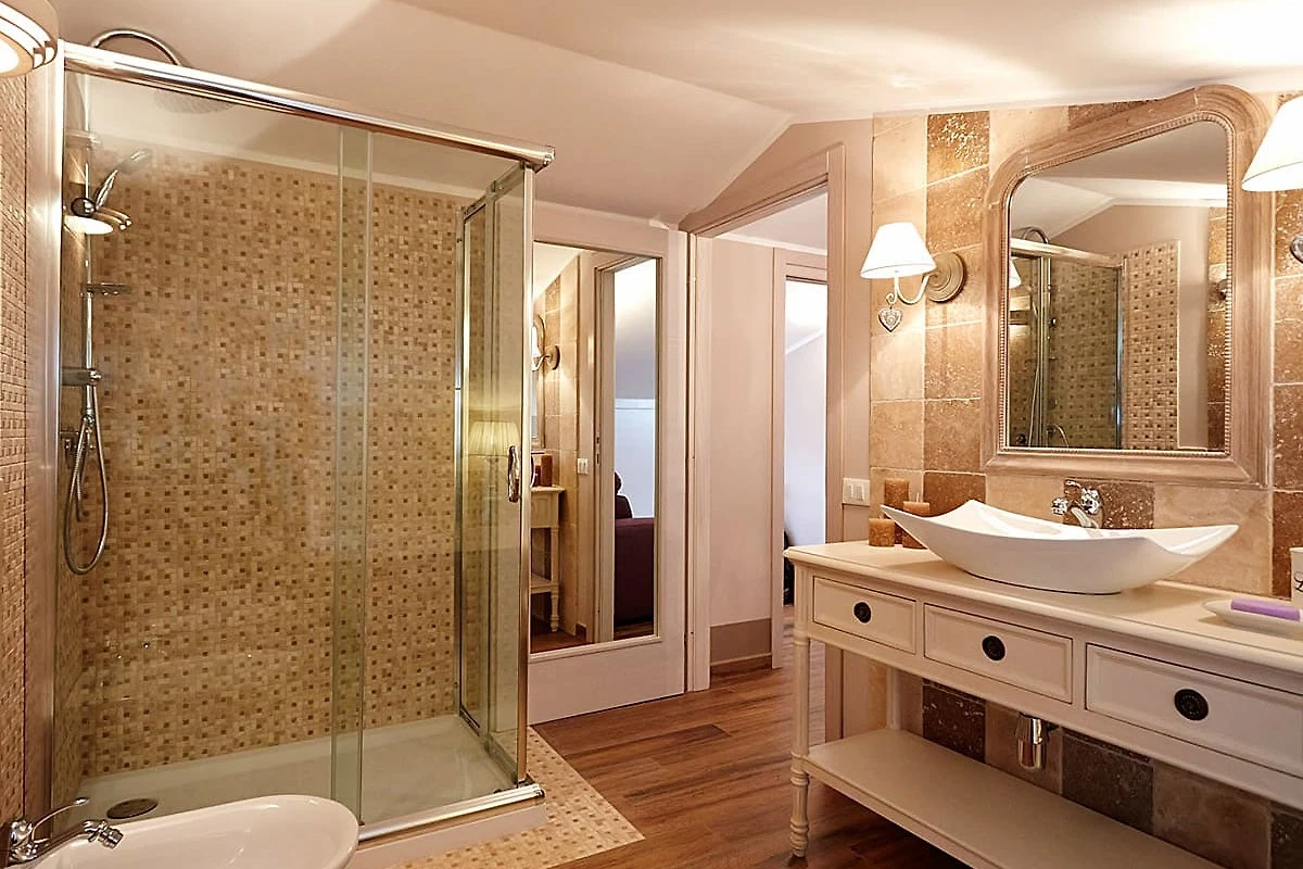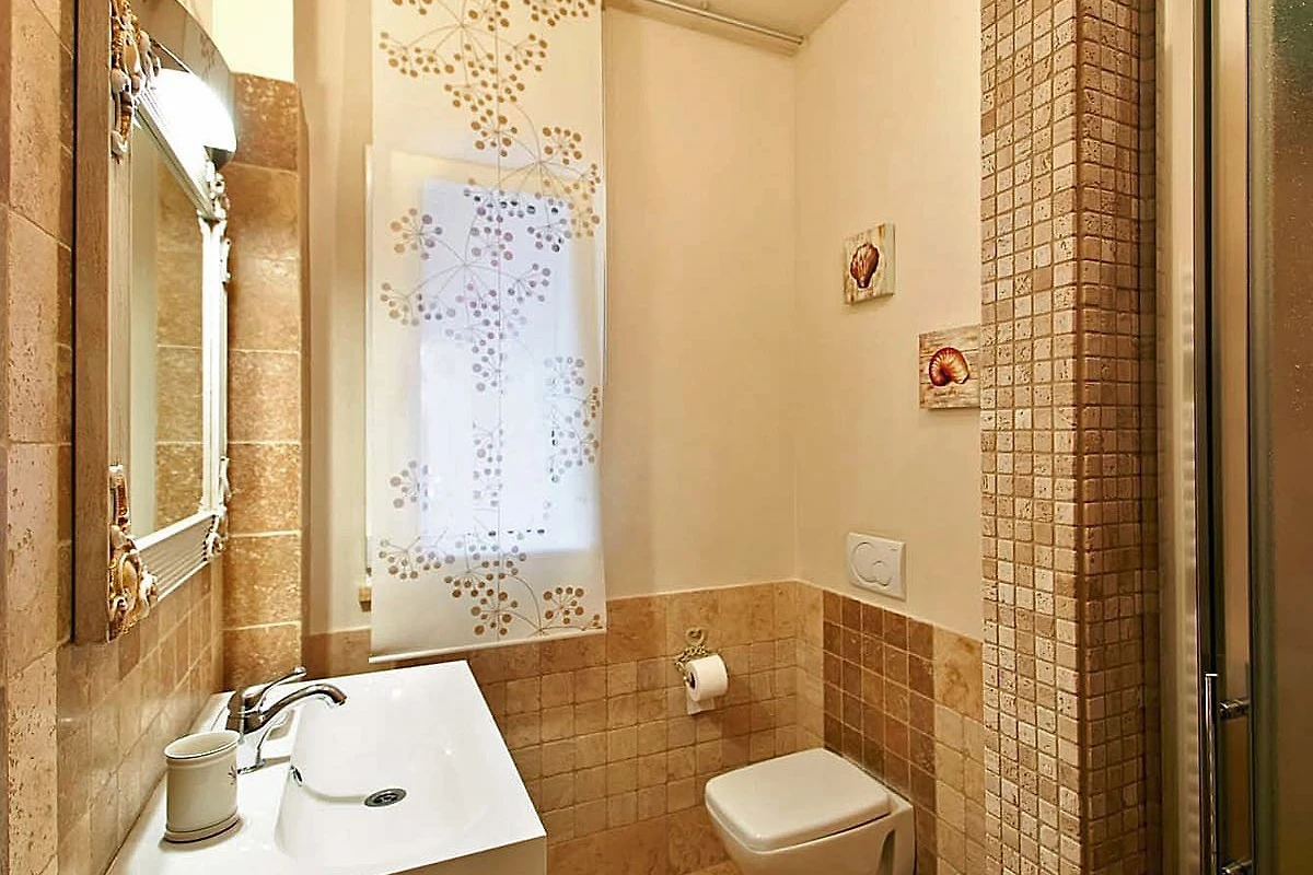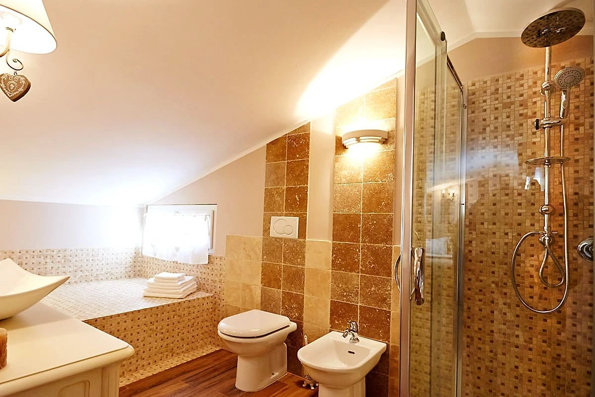 EG: Bad mit Fenster vom Flur aus mit Duschkabine, WC, Bidet und Waschbecken. Die Boden- und Wandfließen sind aus Travertin, dem "toskanischen Marmor".
