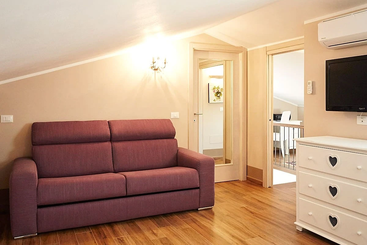 OG: 1 Zweibettzimmer (Betten können zusammengestellt werden) mit Sofa und TV.