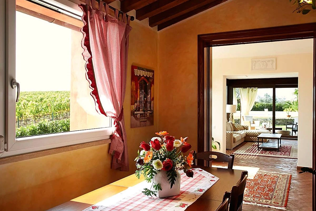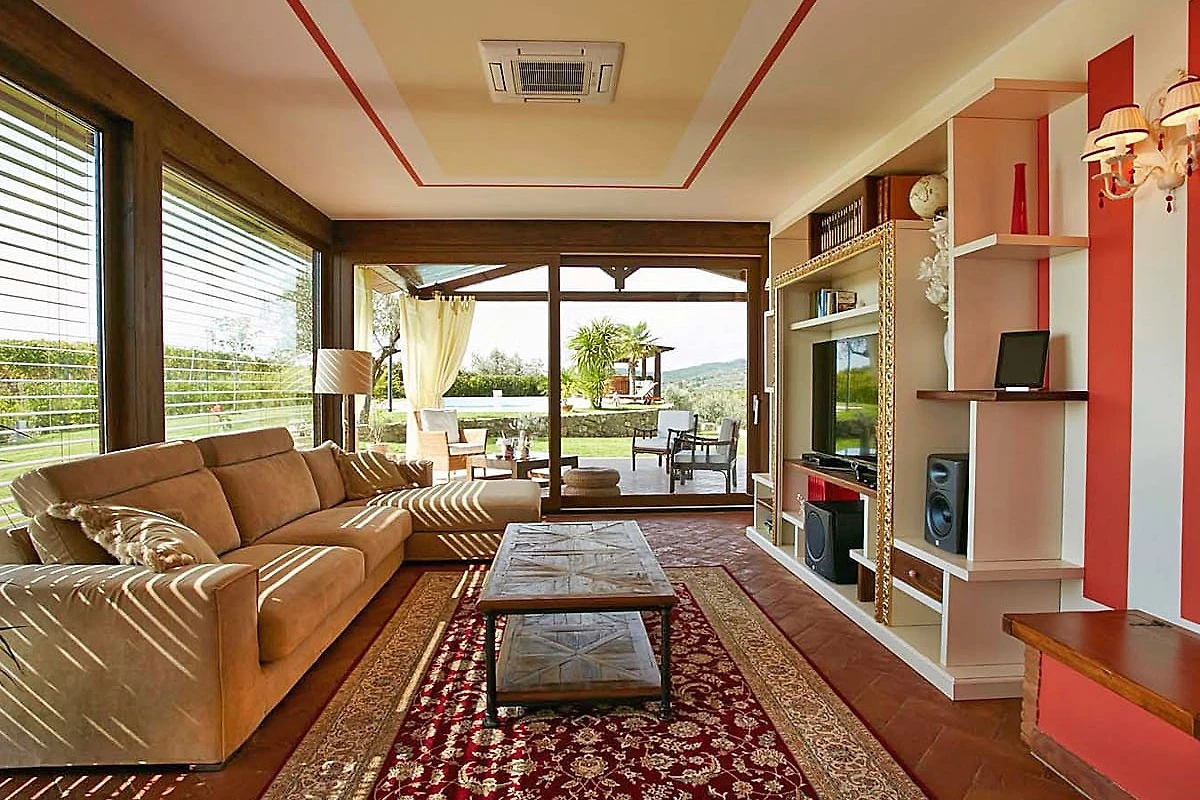 Zwei externe Wände des Raums sind komplett verglast. Die Längsseite kann man mit Jalousien verdunkeln, die Stirnseite hat eine breite Schiebetür über die Sie auf die überdachte Terrasse (30 m²) gelangen, die zum Pool blickt.