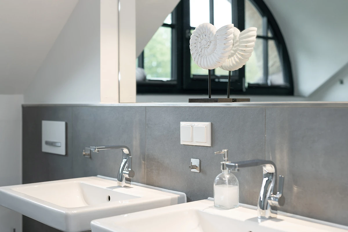Die Bade-Lounge ist direkt vom grossen Schlafzimmer aus zu begehen und bietet mit Badewanne, WC und zwei Waschbecken alle Annehmlichkeiten. Ein zusätzliches Bad mit Dusche, WC und zwei Waschbecken lässt auch bei voller Belegung des Hauses keine Engpässe entstehen.