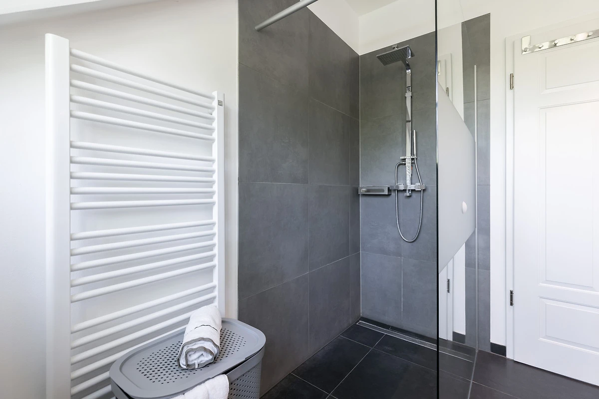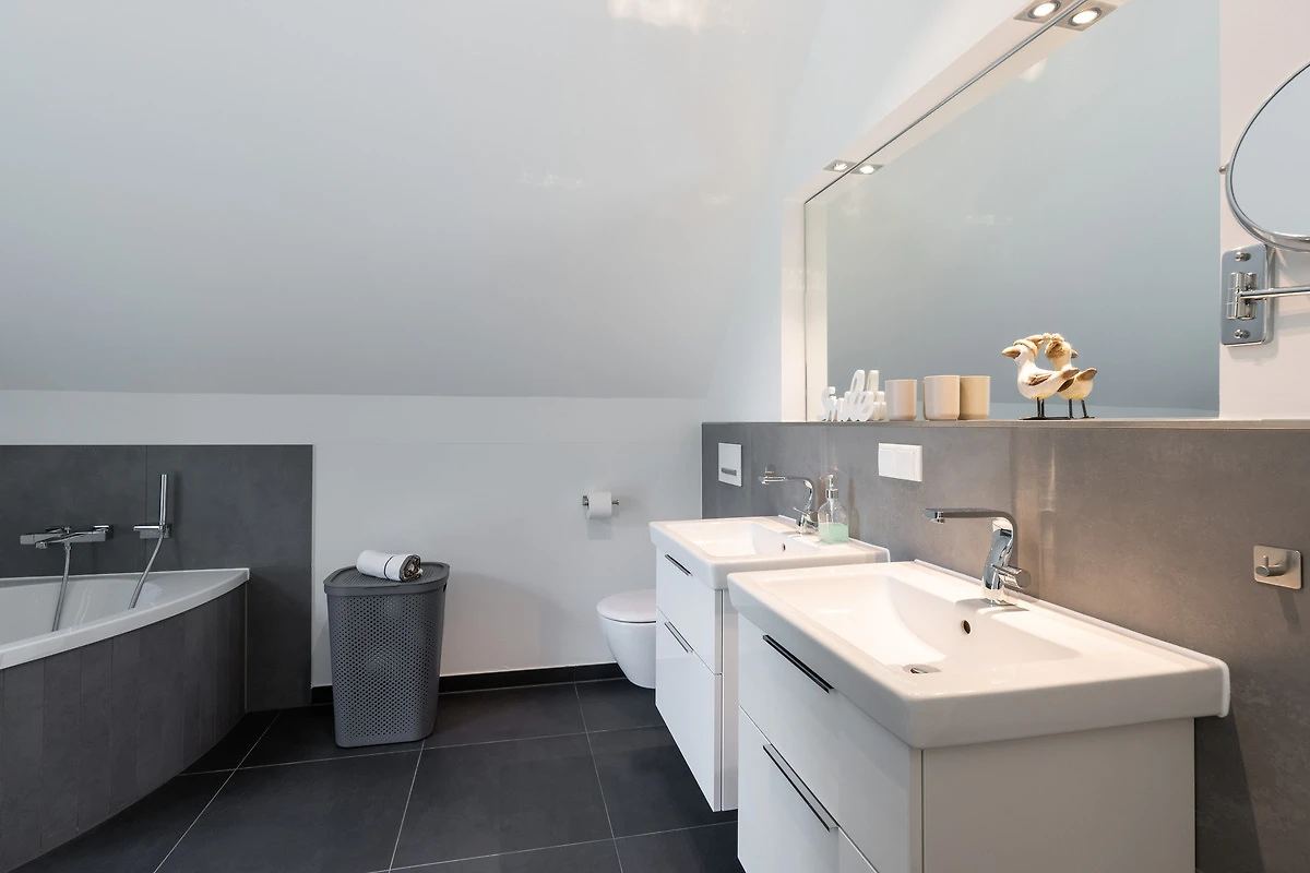 Die Bade-Lounge ist direkt vom Master-Schlafzimmer aus zu begehen und bietet mit Badewanne, WC und zwei Waschbecken alle Annehmlichkeiten. Ein zusätzliches Bad mit Dusche, WC und zwei Waschbecken lässt auch bei voller Belegung des Hauses keine Engpässe entstehen.
