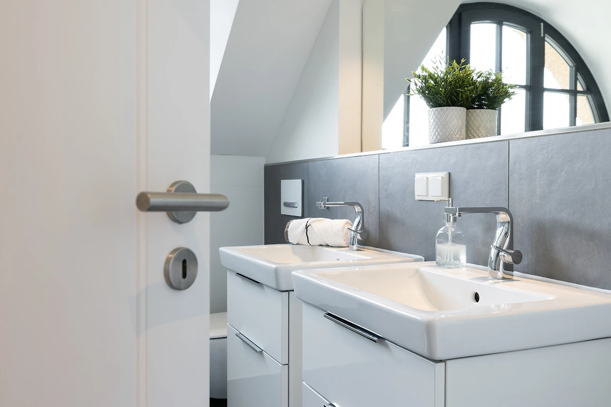 Die Bade-Lounge ist direkt vom Master-Schlafzimmer aus zu begehen und bietet mit Badewanne, WC und zwei Waschbecken alle Annehmlichkeiten. Ein zusätzliches Bad mit Dusche, WC und zwei Waschbecken lässt auch bei voller Belegung des Hauses keine Engpässe entstehen.
