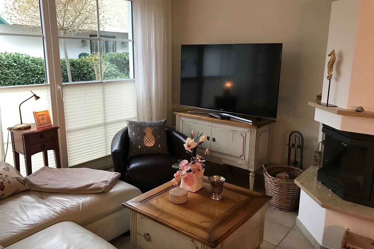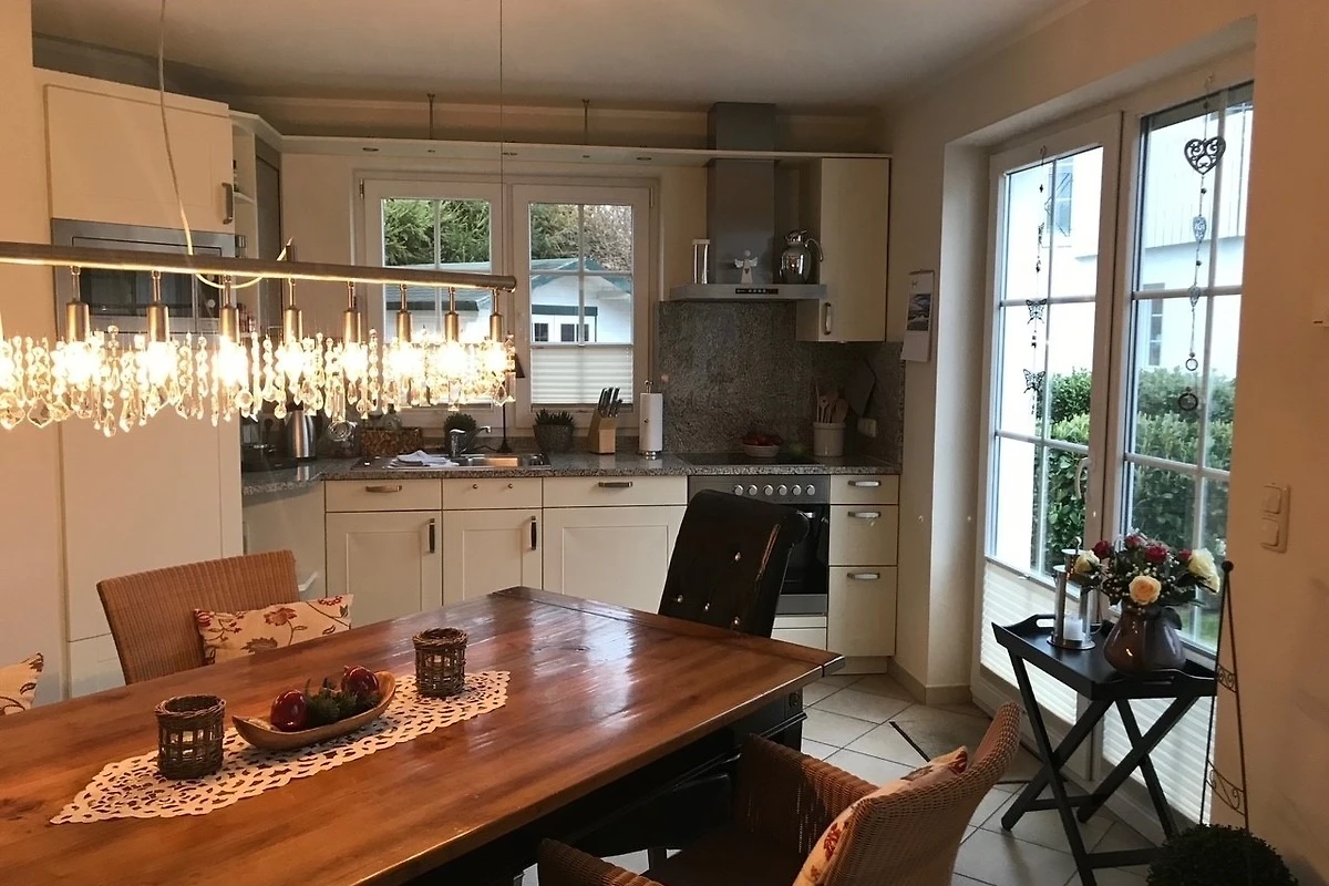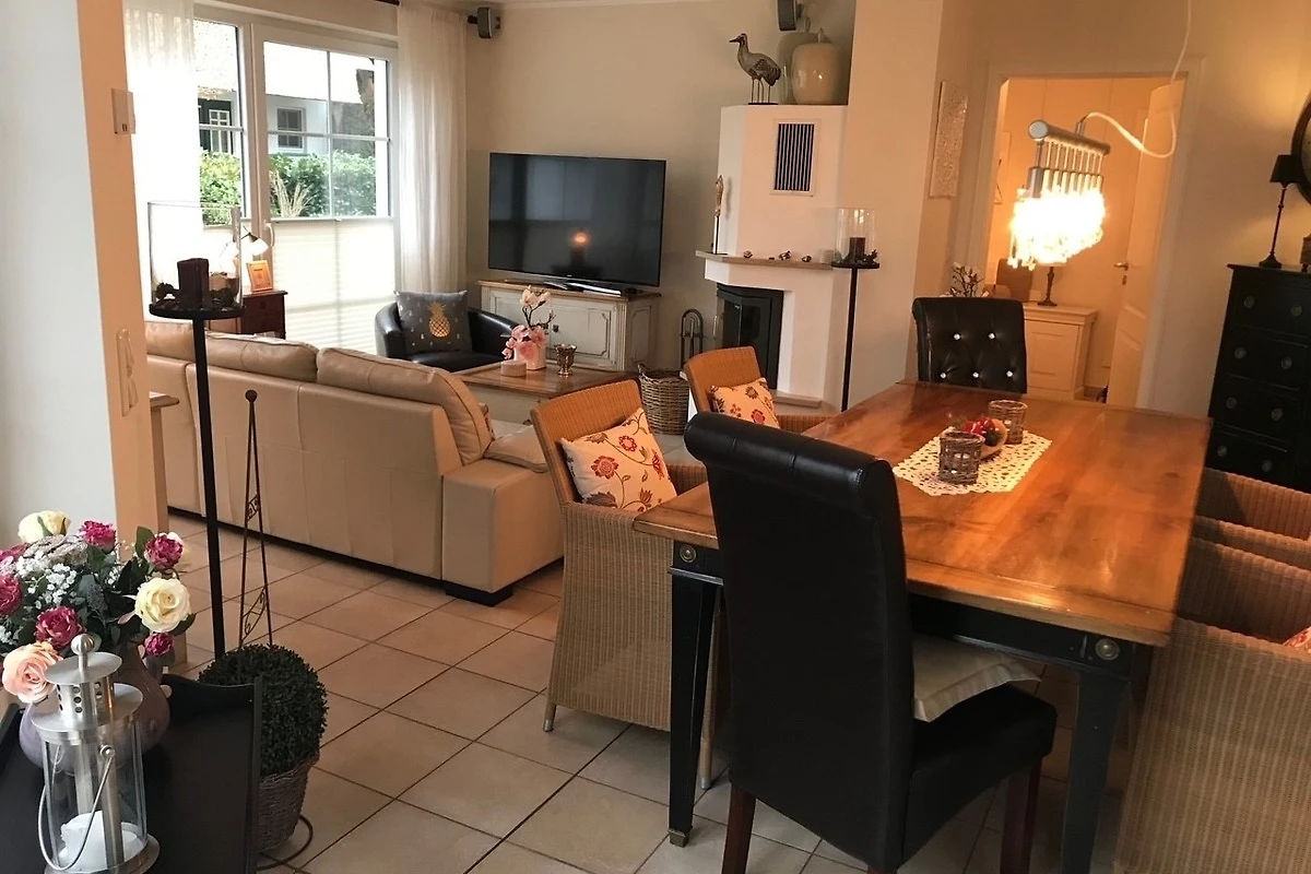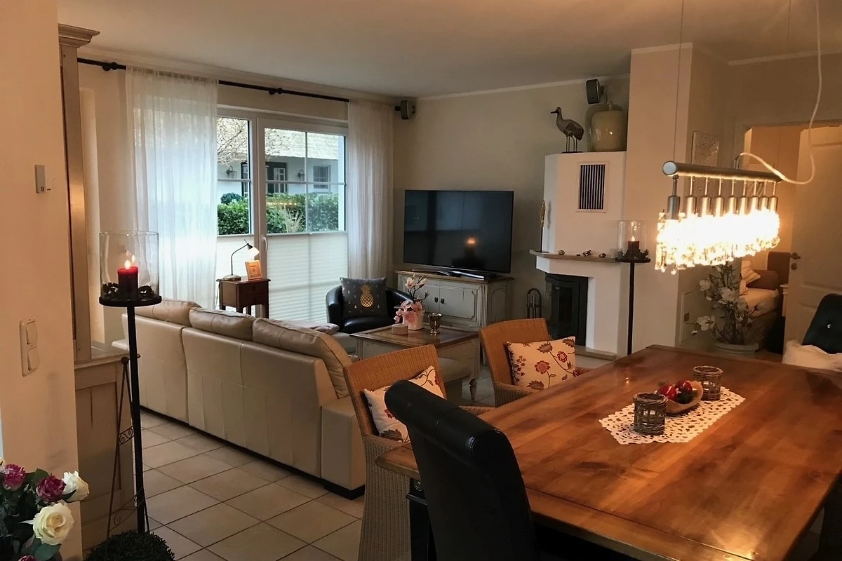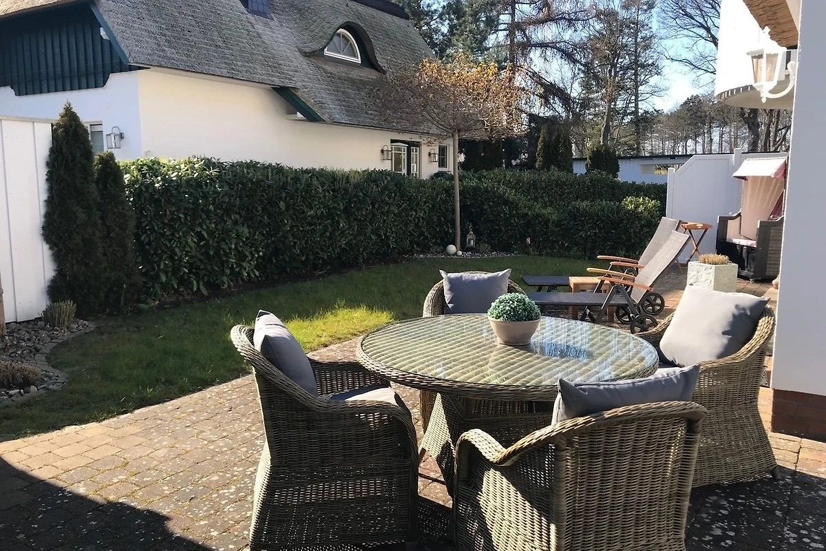 Exklusive Wohnung mit 70qm, 3 Zimmer für 1-4 Personen mit Bad inklusive Dusche und WC sowie einem zusätzlichen Gäste WC, Terrasse und Garten. Diese Wohnung liegt in einer exklusiven Wohnanlage direkt am Deich. Wohnen unter Reet mit direkter Nähe zum Meer. Die komplette Ausstattung dieser Wohnung lässt keine Wünsche offen. Radio, DVD-Player, Grossbild-Fernseher, Dolby-Surround-Analage, Fussbodenheizung, offener Kamin, komplette Küchenzeile mit Kaffemaschine, Mikrowelle, Geschirrspüler und Kühlschrank. Die Waschmaschine und der Trockner können gegen Gebühr genutzt werden. Kostenlose Nutzung der Gemeinschaftssauna. Geniessen Sie Ihren Urlaub auf der Terasse, oder einen romantischen Abend vor dem offenen Kamin im Wohnzimmer. Auch und besonders im Winter ist Zingst immer eine Reise wert.In dieser Wohnung sind keine Haustiere erlaubt.