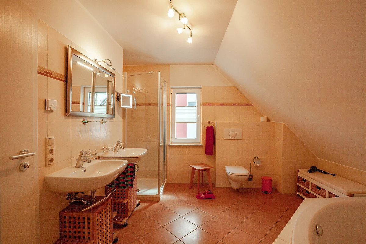 Das grosszügige Bad im OG mit Eckbadewanne, Doppel-Waschtisch, WC und Dusche betreten Sie vom