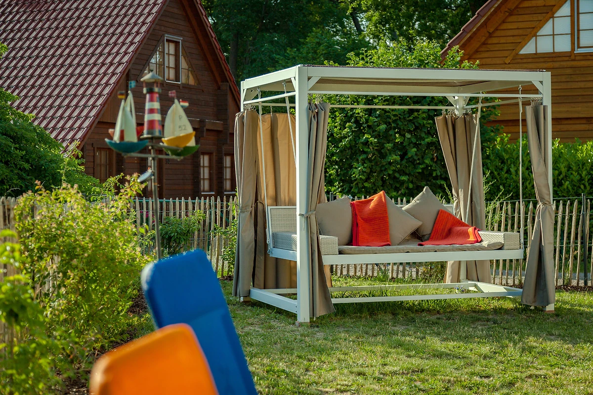 Im komplett umzäunten Garten warten schon Terrassenmöbel, Sonnenliegen und eine Hawaii-Schaukel auf