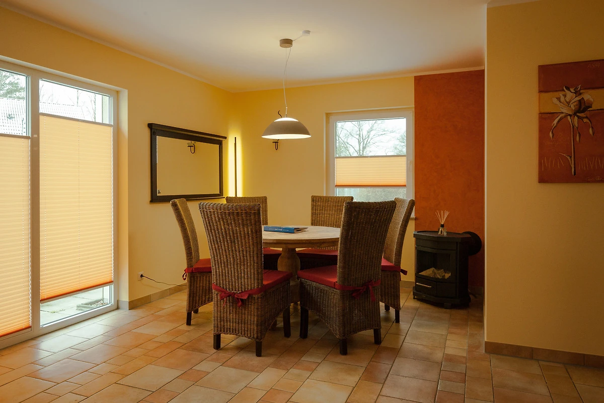 Für Spieleabende eignet sich zudem der grosse, runde Esstisch ideal. Ein Gaskamin sorgt auf Knopfdruck