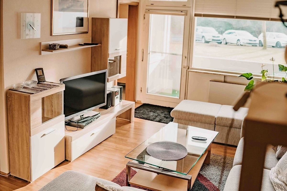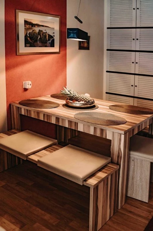 Das Badezimmer mit Duschbad sowie das zusätzliche Gäste-WC sorgen für zusätzlichen Komfort. Zur Unterhaltung dient eine HiFi-Anlage und ein Fernseher. Ein Esstisch lädt zu gemeinsamen Mahlzeiten ein.