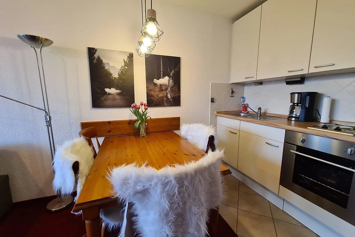 Die Ferienwohnung bietet einen privaten Balkon, der zum Entspannen und Geniessen der frischen Luft einlädt. Hier kann man den Tag bei einem Kaffee ausklingen lassen oder die Umgebung bewundern. Der Aussenbereich ist ideal, um die Ruhe der Natur zu erleben und den Blick über die Landschaft schweifen zu lassen. Eine perfekte Auszeit für jeden Gast.