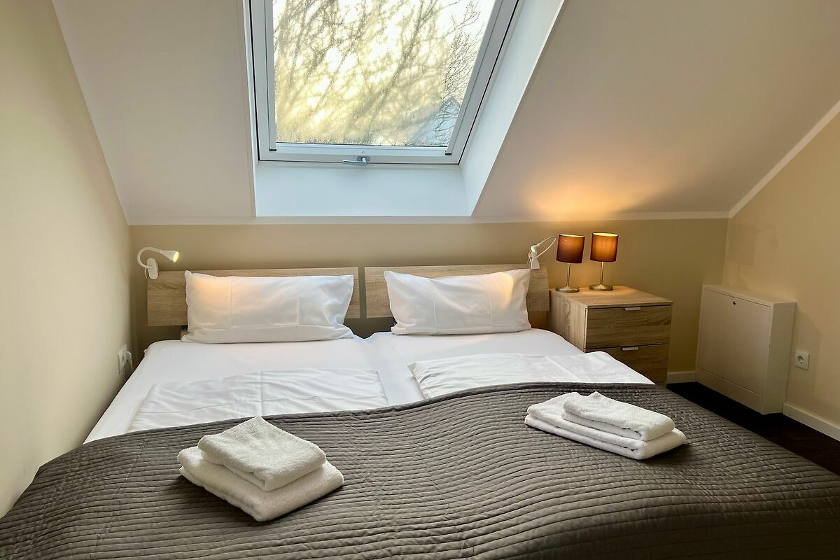 Im Obergeschoss befinden sich zwei weitere Schlafzimmer mit jeweils einem Doppelbett – eines davon mit Zugang zum schönen Balkon – sowie ein Duschbad mit WC.