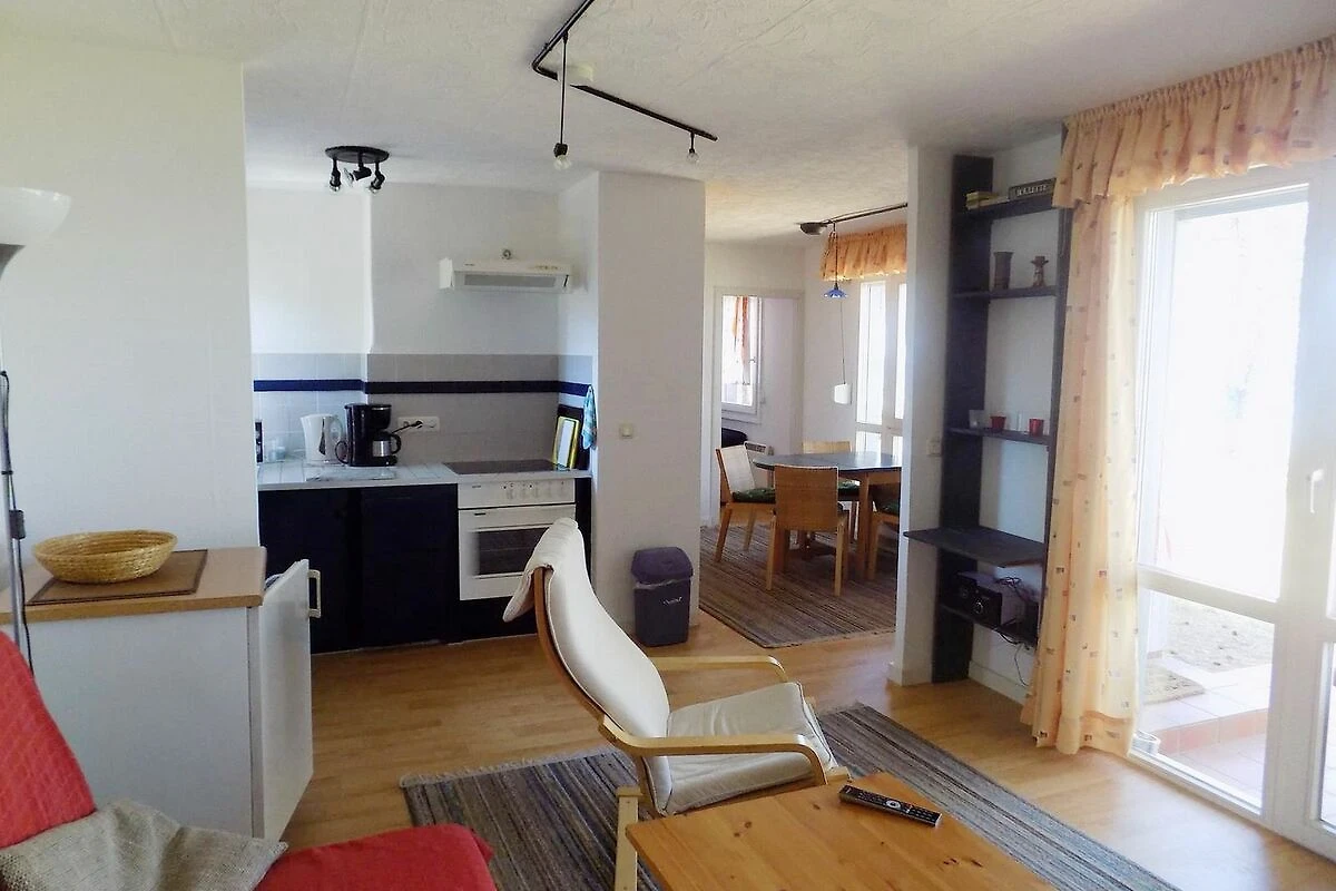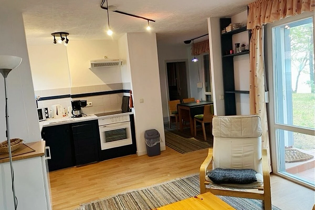 Einbauküche mit Kühlschrank/Gefrierfach, Backofen, Umlufthaube, Geschirrspüler, Kaffeemaschine, Wasserkocher, Toaster, Mikrowelle sowie Sitzecke für 4 Personen