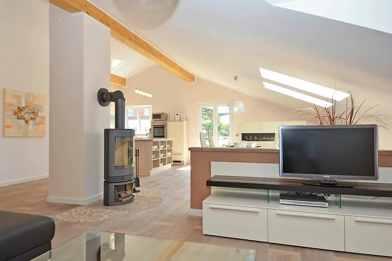 Im 53 m² grossen kombinierten Wohn- und Essbereich befinden sich eine behagliche Sitzecke mit Eckcouch sowie als besonderes Highlight der drehbare Kamin, der sich in der Mitte des Wohnraumes befindet. Zur technischen Ausstattung gehören ein Flachbild-TV, eine Stereoanlage inkl. DVD-Player, MP3 Player und IPod Anschluss. Die perfekt in den Wohnbereich integrierte Küchenzeile ist komplett ausgestattet mit einem Backofen in Augenhöhe, einer Geschirrspülmaschine, einem Kühlschrank mit Gefrierfach, Kaffeemaschine, Toaster, Wasserkocher und weiteren Kochutensilien. Der 4-Platten-Cerankochfeld befindet sich auf der separaten Kochinsel.