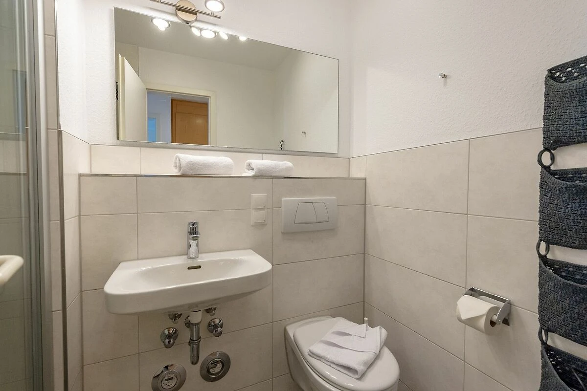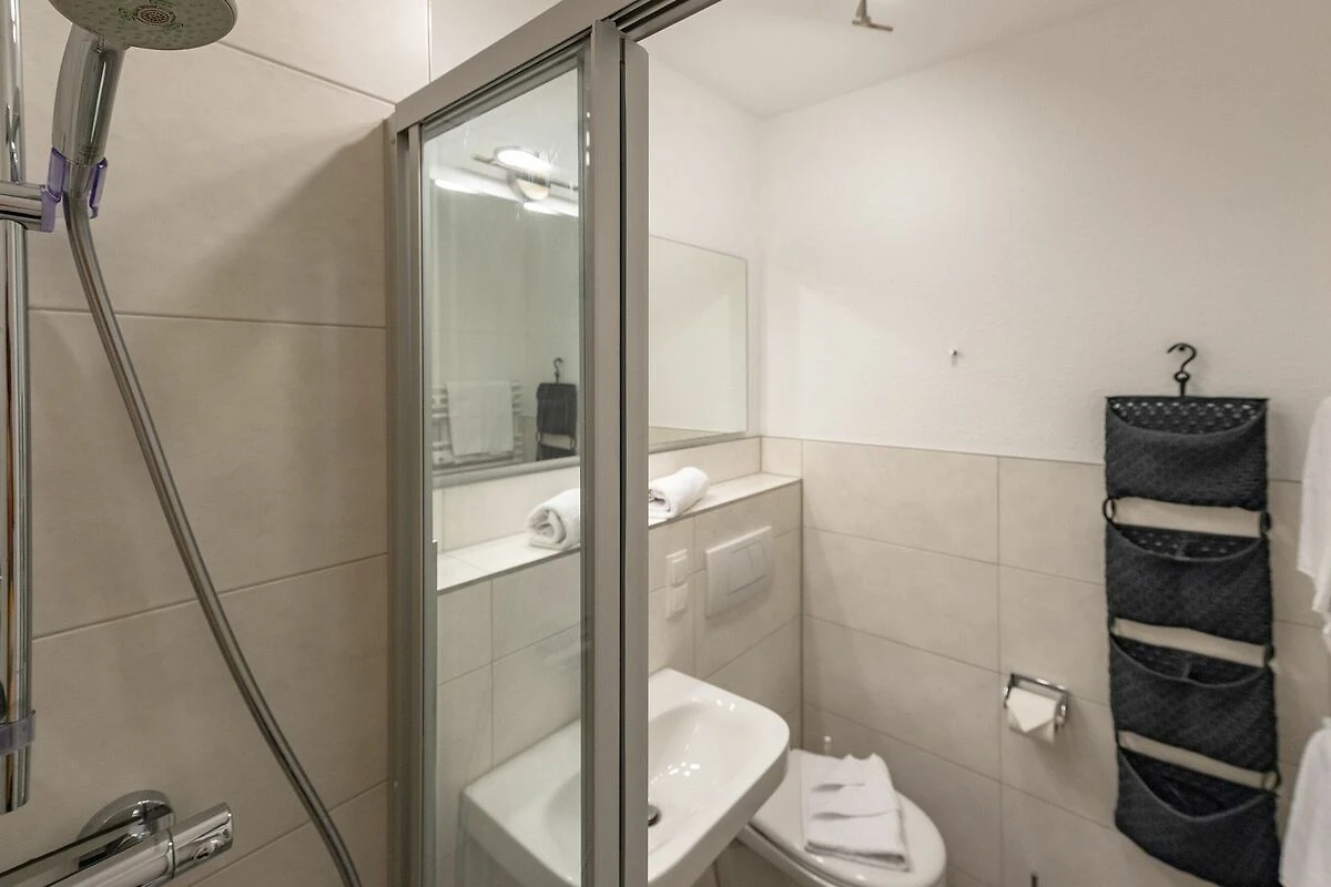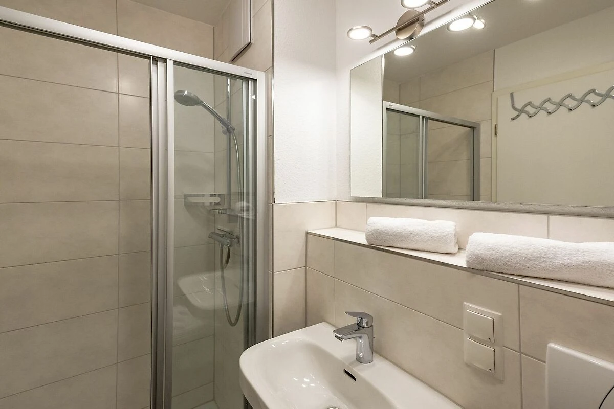 Die Wohlfühloase der Wohnung ist das moderne Duschbad mit grosser Dusche, Waschtisch, WC, beheizbarem Handtuchhalter und Fön.