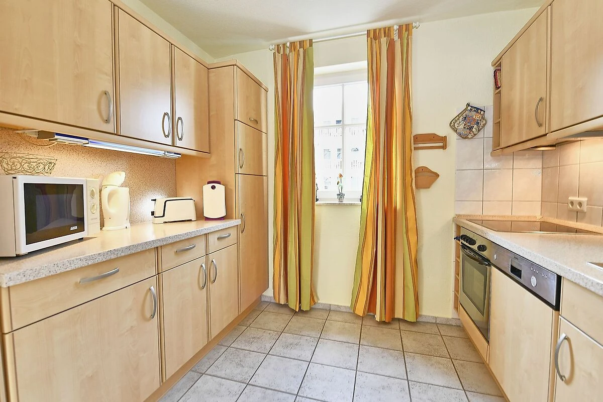 Die separate Küche ist komplett ausgestattet mit einem 4-Zonen-Cerankochfeld, einem Backofen, einem grossen Kühlschrank mit Tiefkühlfach, einer Mikrowelle, einer Geschirrspülmaschine und diversem Kleininventar.