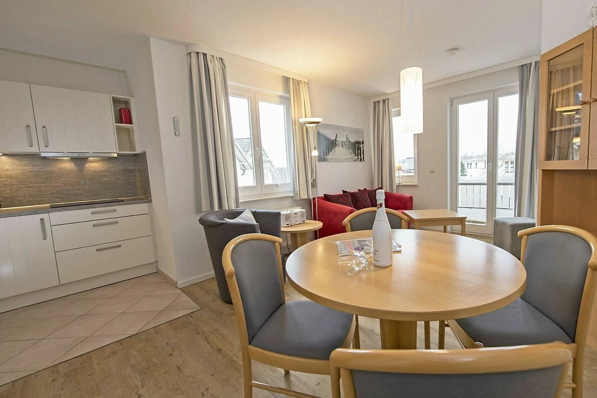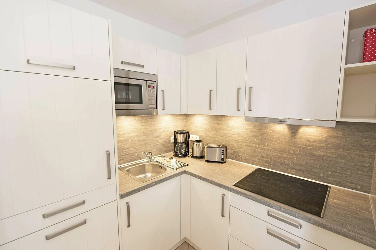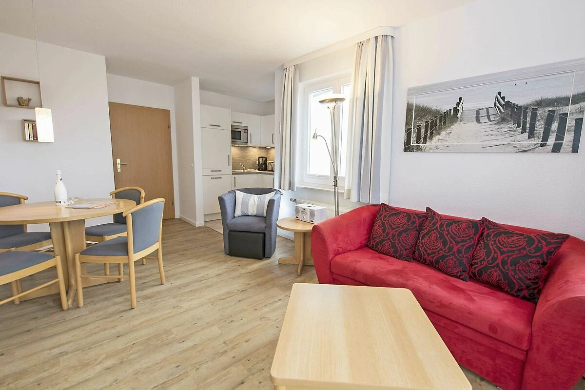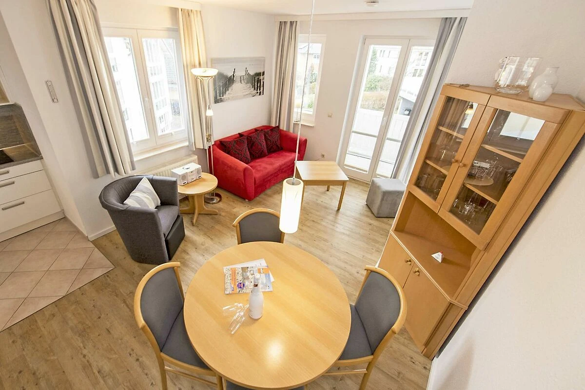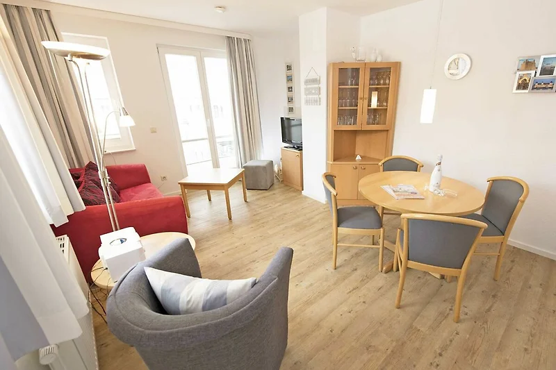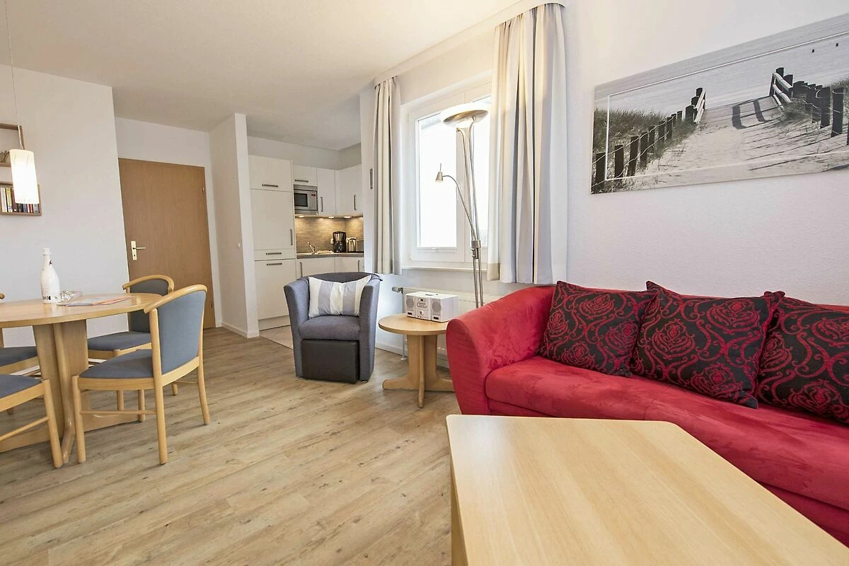 Der Wohnraum verfügt über einen Esstisch, einen Sessel und eine Schlafcouch, die als Aufbettung für 1 Person genutzt werden kann, eine Mini-Stereoanlage mit CD-Player, einen Flachbild-TV und eine im Wohnbereich harmonisch integrierte Küchenzeile. Diese ist ausgestattet mit einem Kühlschrank mit Gefrierfach, einer Mikrowelle, einem Cerankochfeld, Wasserkocher, Kaffeemaschine, Toaster und diversem Kleininventar, das die Küchenausstattung komplettiert.