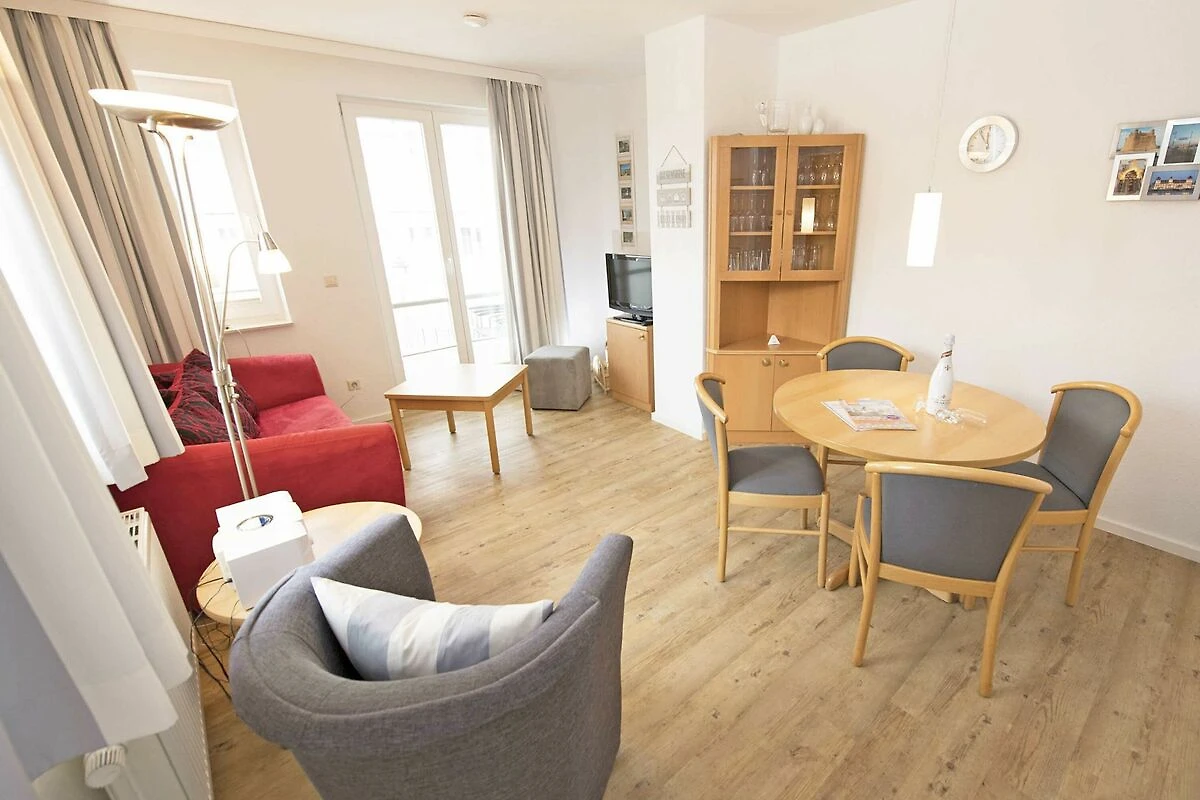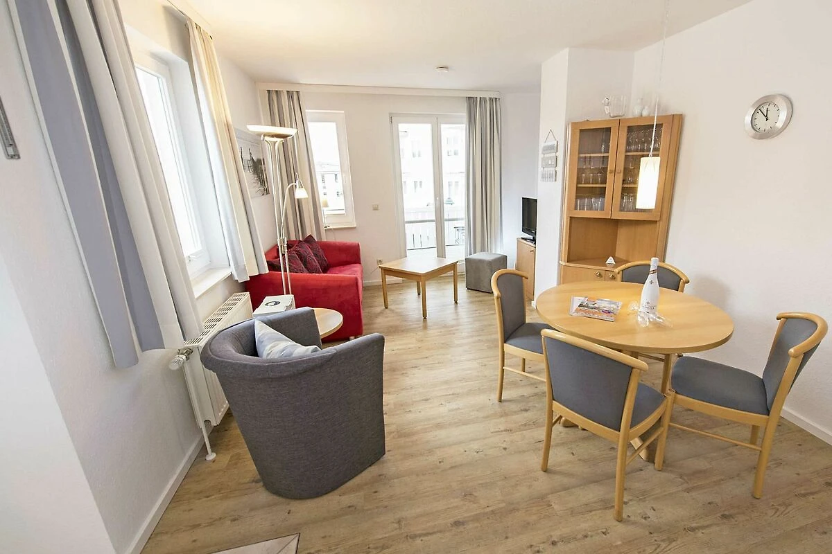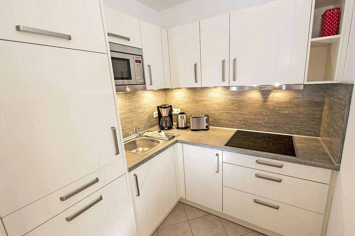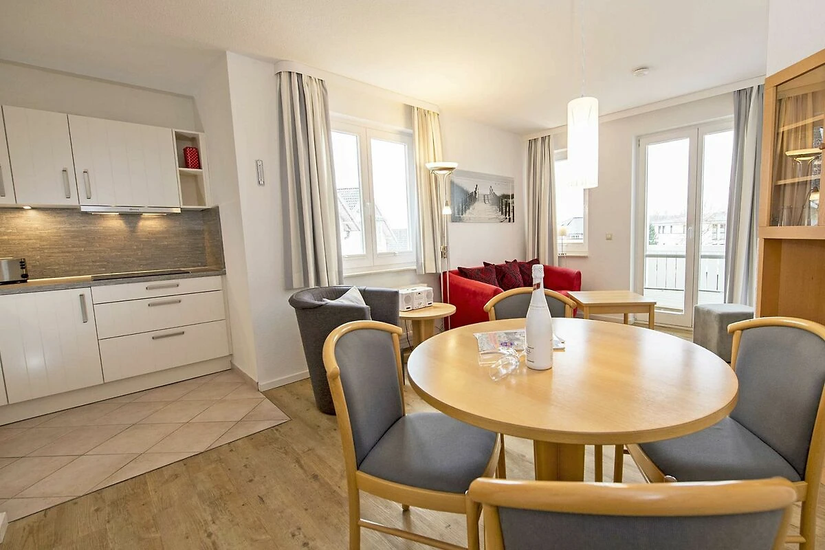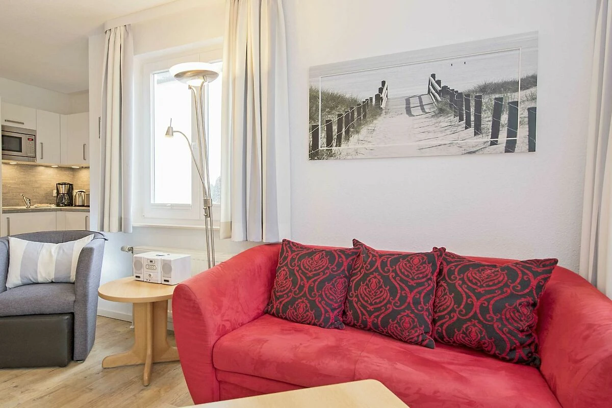 Der Wohnraum verfügt über einen Esstisch, einen Sessel und eine Schlafcouch, die als Aufbettung für 1 Person genutzt werden kann, eine Mini-Stereoanlage mit CD-Player, einen Flachbild-TV und eine im Wohnbereich harmonisch integrierte Küchenzeile. Diese ist ausgestattet mit einem Kühlschrank mit Gefrierfach, einer Mikrowelle, einem Cerankochfeld, Wasserkocher, Kaffeemaschine, Toaster und diversem Kleininventar, das die Küchenausstattung komplettiert.