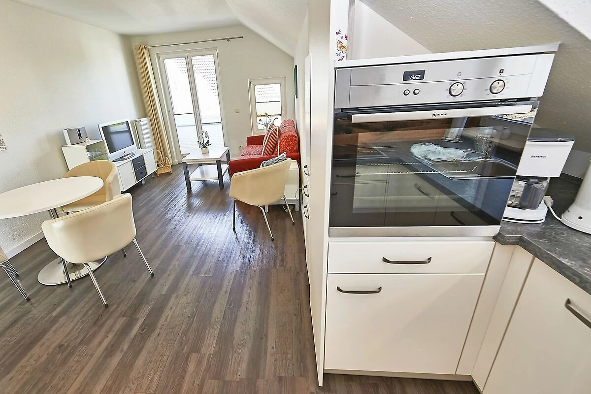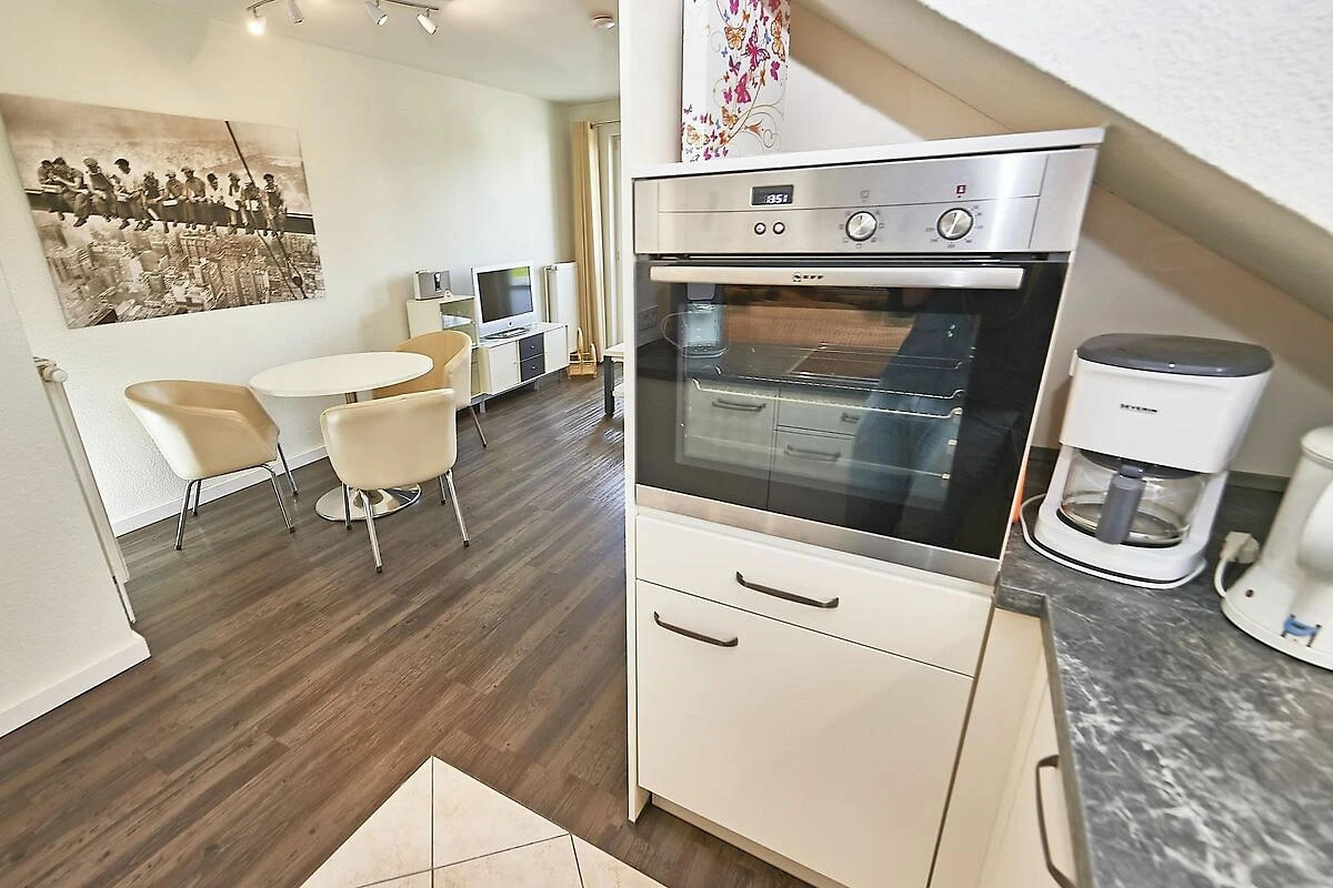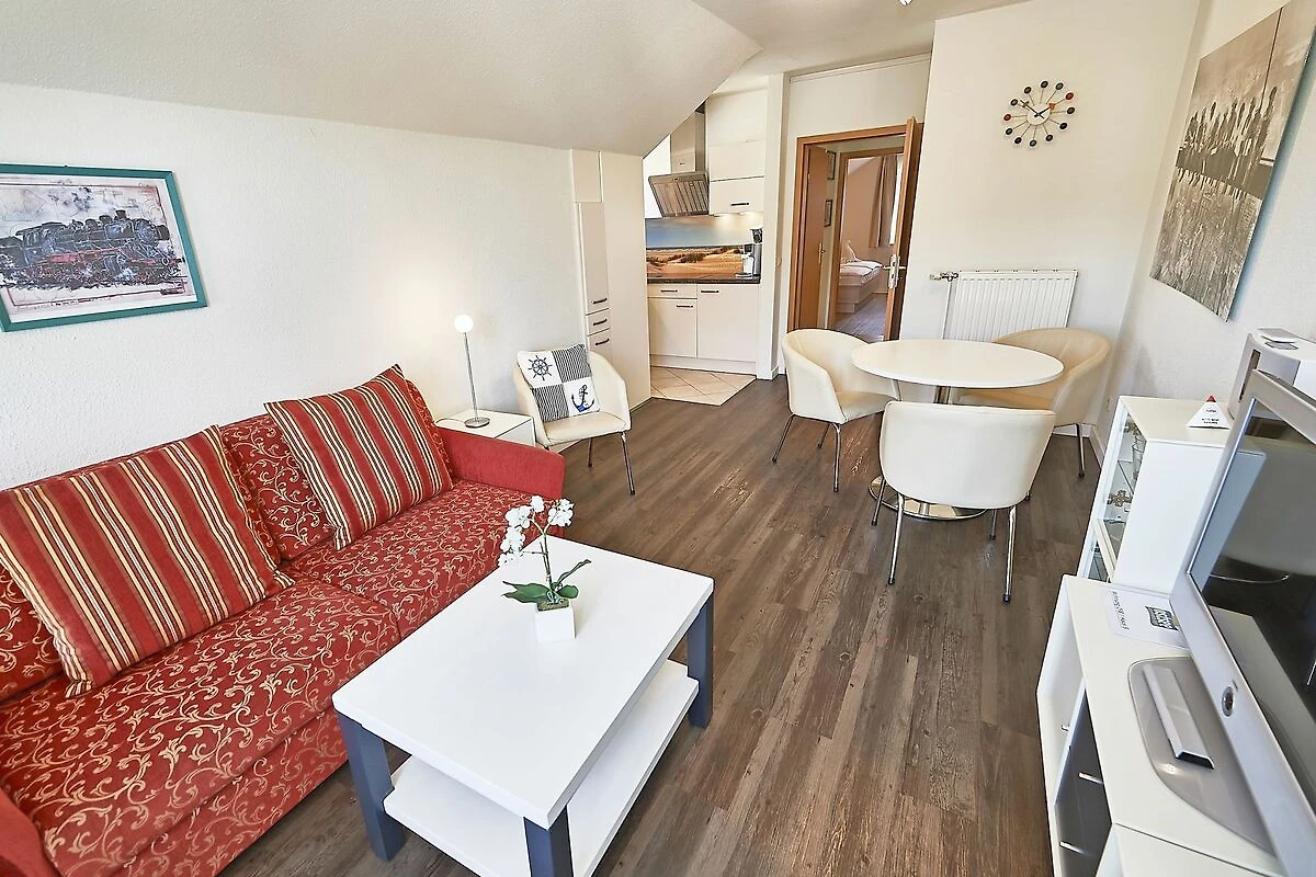 Der Wohnraum verfügt über einen Esstisch, eine Schlafcouch, die als Aufbettung für 2 Personen genutzt werden kann, eine BOSE Bluetooth-Soundanlage, einen Flachbild-TV und eine im Wohnbereich harmonisch integrierte Küchenzeile. Diese ist ausgestattet mit einem Kühlschrank mit Gefrierfach, einem 4-Zonen-Cerankochfeld, Backofen, Geschirrspüler, Wasserkocher, Kaffeepadmaschine Senseo Duo Latte, Toaster und diversem Kleininventar, das die Küchenausstattung komplettiert.