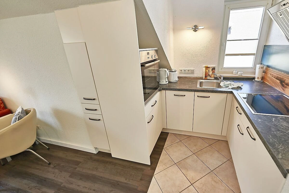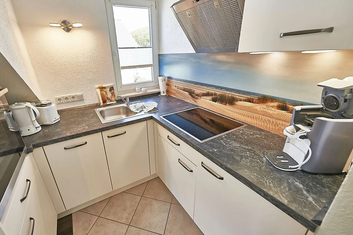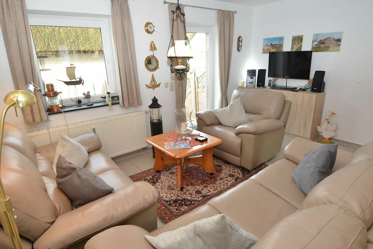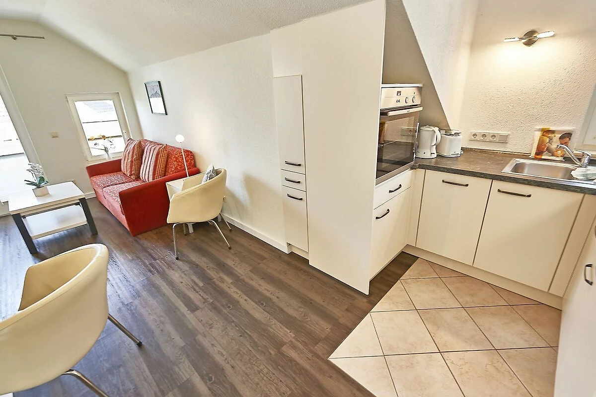 Der Wohnraum verfügt über einen Esstisch, eine Schlafcouch, die als Aufbettung für 2 Personen genutzt werden kann, eine BOSE Bluetooth-Soundanlage, einen Flachbild-TV und eine im Wohnbereich harmonisch integrierte Küchenzeile. Diese ist ausgestattet mit einem Kühlschrank mit Gefrierfach, einem 4-Zonen-Cerankochfeld, Backofen, Geschirrspüler, Wasserkocher, Kaffeepadmaschine Senseo Duo Latte, Toaster und diversem Kleininventar, das die Küchenausstattung komplettiert.