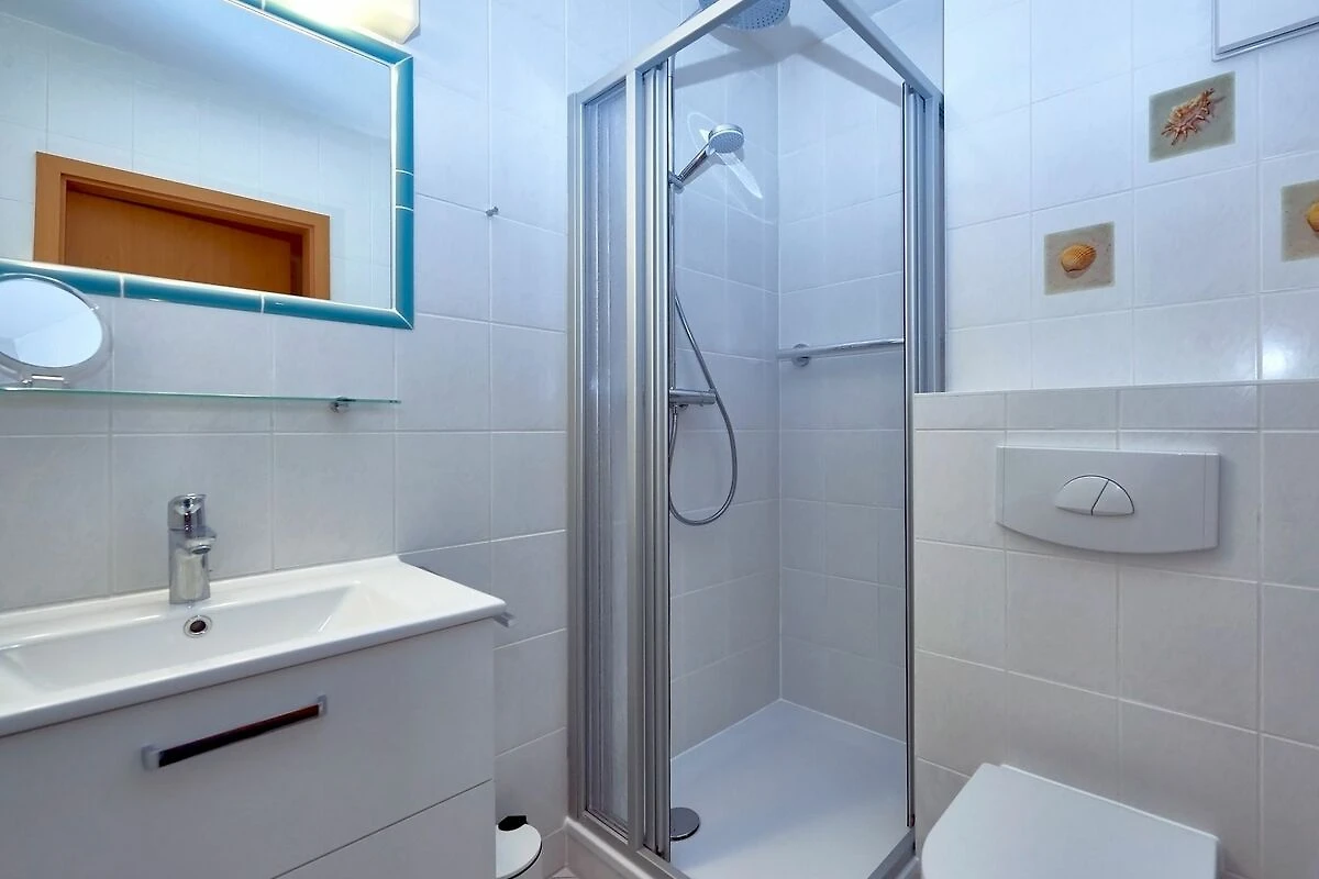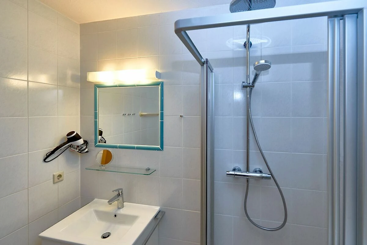 Weiterhin gibt es ein Schlafzimmer mit einem Doppelbett und seniorengerechter Betthöhe, einem zusätzlichen Fernseher und ausreichend Platz für Ihre Garderobe sowie ein Bad mit Dusche/WC und einem Haartrockner.