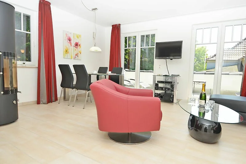 Der ca. 23 m² umfassende Wohn-/Essbereich ist mit einem grossen Esstisch und eine gemütliche Sitzecke mit hochwertigen Ledermöbeln ausgestattet. Das Entertainment übernehmen ein Sony-Flachbild-TV in Verbindung mit einer Bose-Soundbar incl. Bluetooth-Schnittstelle zum Anschluss Ihres Smartphones oder Tablet. W-LAN steht Ihnen kostenfrei zur Verfügung.