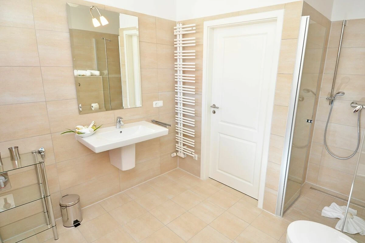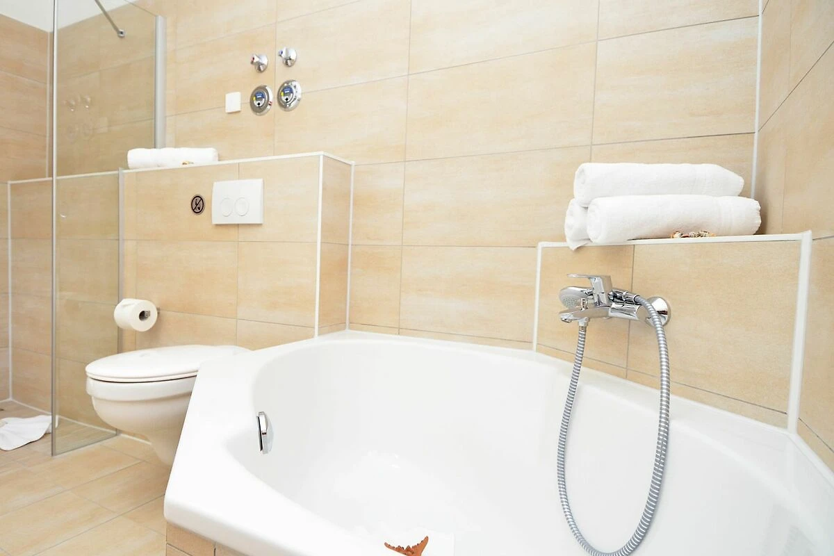 Die Wohnung verfügt über ein grosses lichtdurchflutetes Badezimmer mit einer Eckbadewanne, einer bodengleichen Dusche und einem Handtuchheizkörper. Das zweite Bad ist ebenfalls mit einer bodengleichen Dusche (90x130cm) und einem Handtuchheizkörper ausgestattet. Ein Haartrockner ist ebenfalls vorhanden.