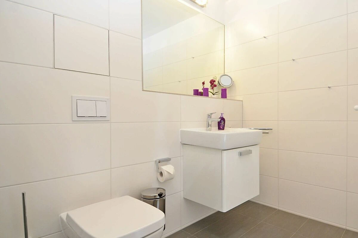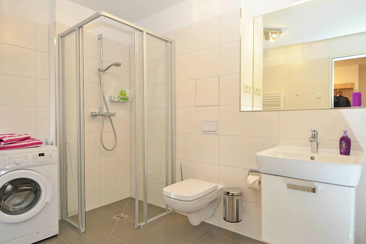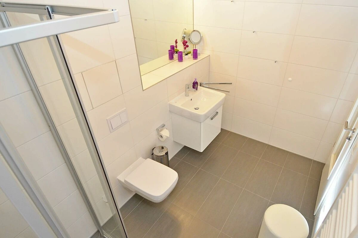 Die Wohnung verfügt über ein modern gefliestes Bad mit bodengleicher Dusche. Neben einem Kosmetikspiegel finden Sie einen Haartrockner und einen elektrischen Handtuchtrockner. Waschmaschine, Bügeleisen und Bügelbrett stehen Ihnen ebenso zu Ihrer Nutzung zur Verfügung.
