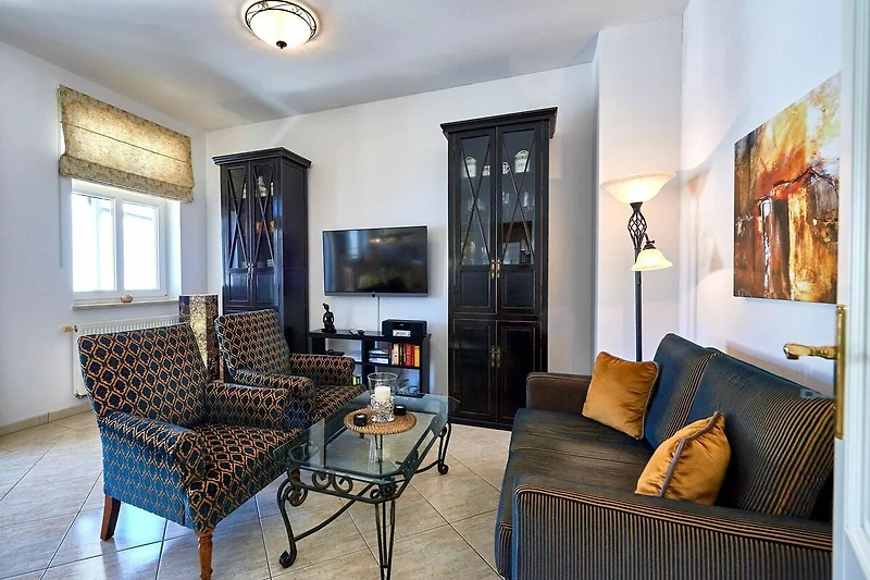 Die romantische Einrichtung dieser Wohnung verleiht eine besonders behagliche Wohlfühl-Atmosphäre. Der sehr grosszügige Wohnraum verfügt über einen Loewe-TV inkl. Soundbar [&] Internetradio und einen DVD-Player. Eine gemütliche Couch und zwei bequeme Sessel laden zum Entspannen und Relaxen ein. Kostenfreies W-LAN ist natürlich auch vorhanden.